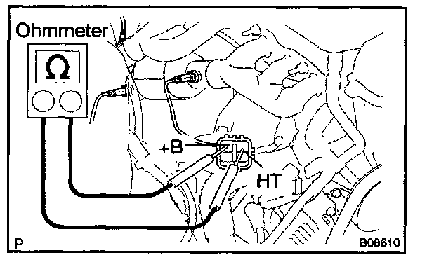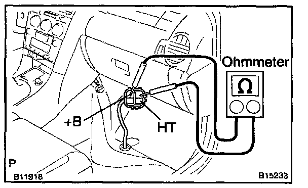 b. Using an ohmmeter, measure the resistance between the terminals +B and HT.