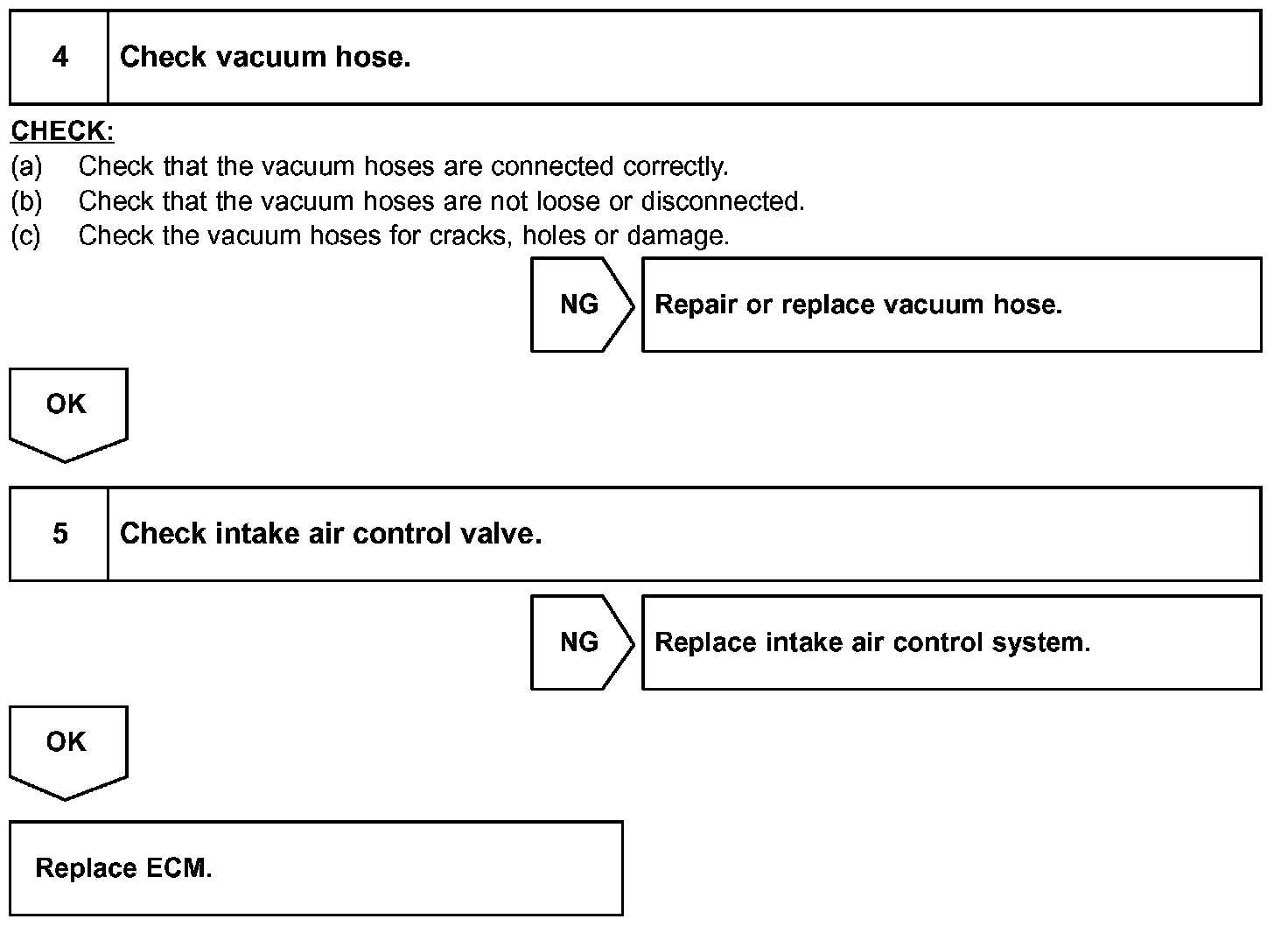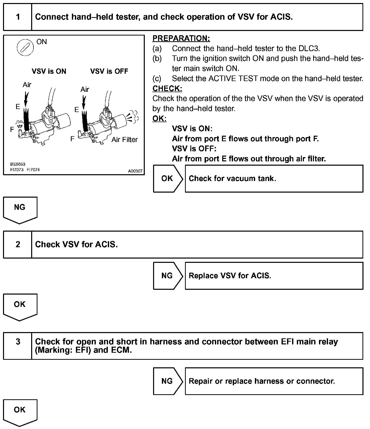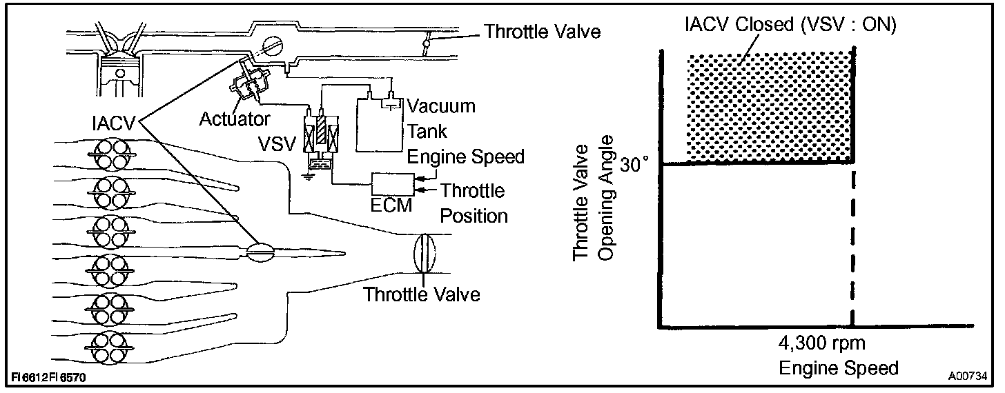 When the engine speed is 4,300 rpm or less and the throttle valve opening angle is 30 ° or more, the ECM turns the VSV ON and closes the IACV. At all other times, the VSV is OFF, so the IACV is open.
