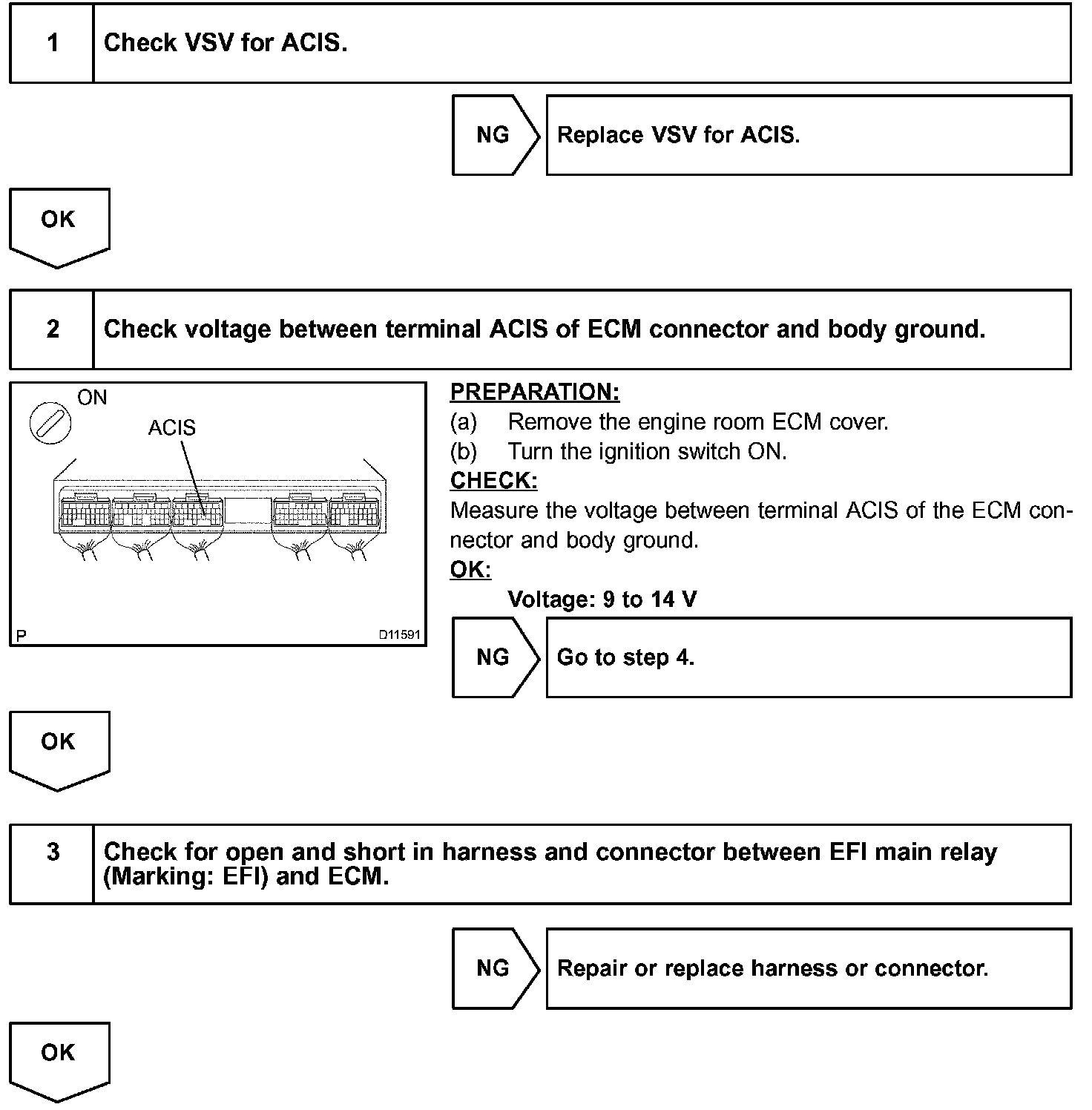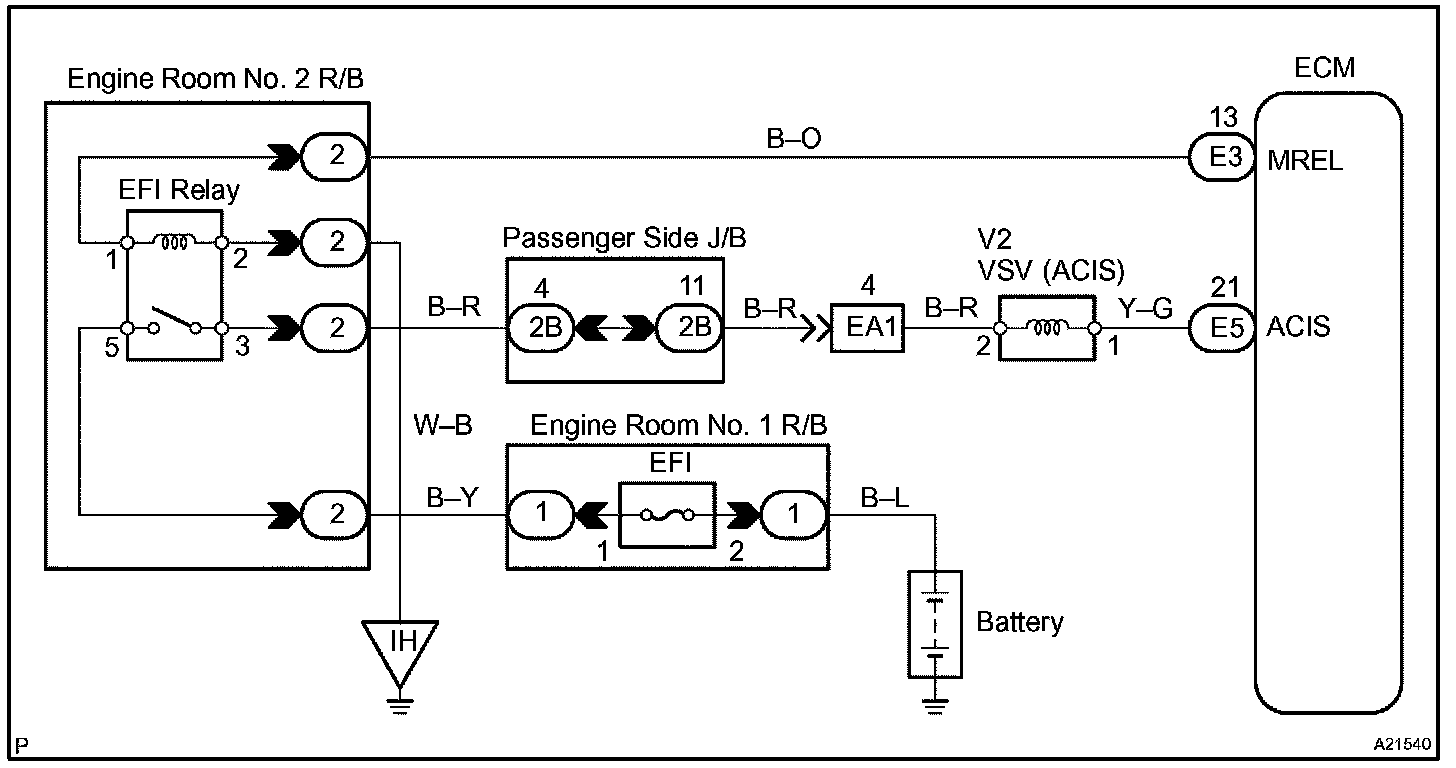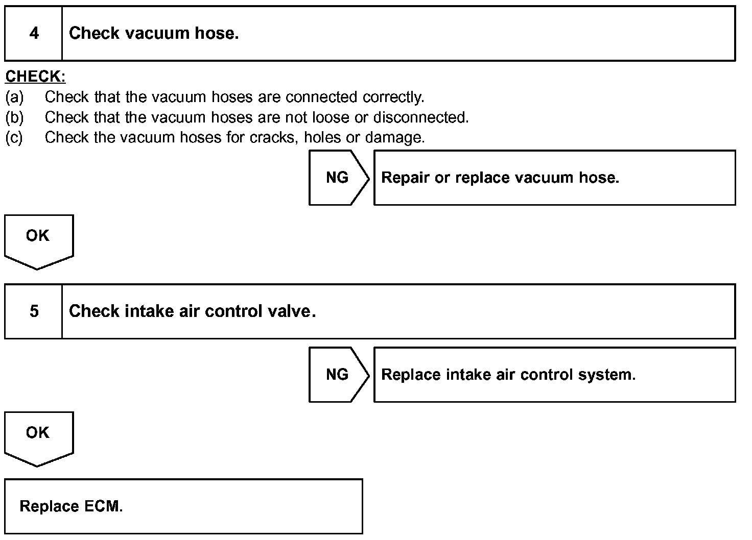 When the engine speed is 4,300 rpm or less and the throttle valve opening angle is 30 ° or more, the ECM turns the VSV ON and closes the IACV. At all other times, the VSV is OFF, so the IACV is open.