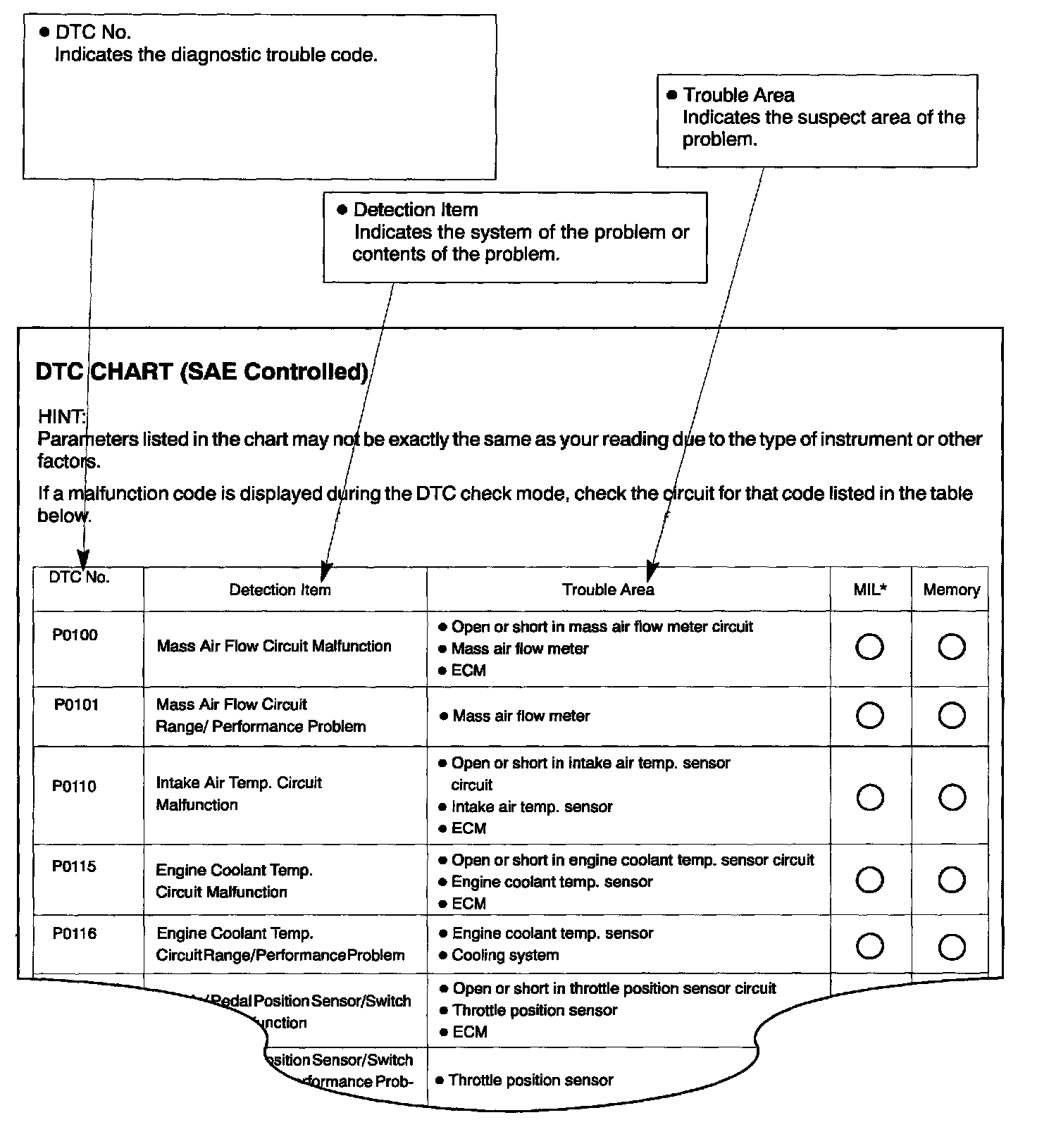 DIAGNOSTIC TROUBLE CODE CHARTThe inspection procedure is shown in the table. This table permits efficient and accurate troubleshooting using the diagnostic trouble codes displayed in the diagnostic trouble code check. Proceed with troubleshooting in accordance with the inspection procedure given in the diagnostic chart corresponding to the diagnostic trouble codes displayed. The engine diagnostic trouble code chart is shown as an example.