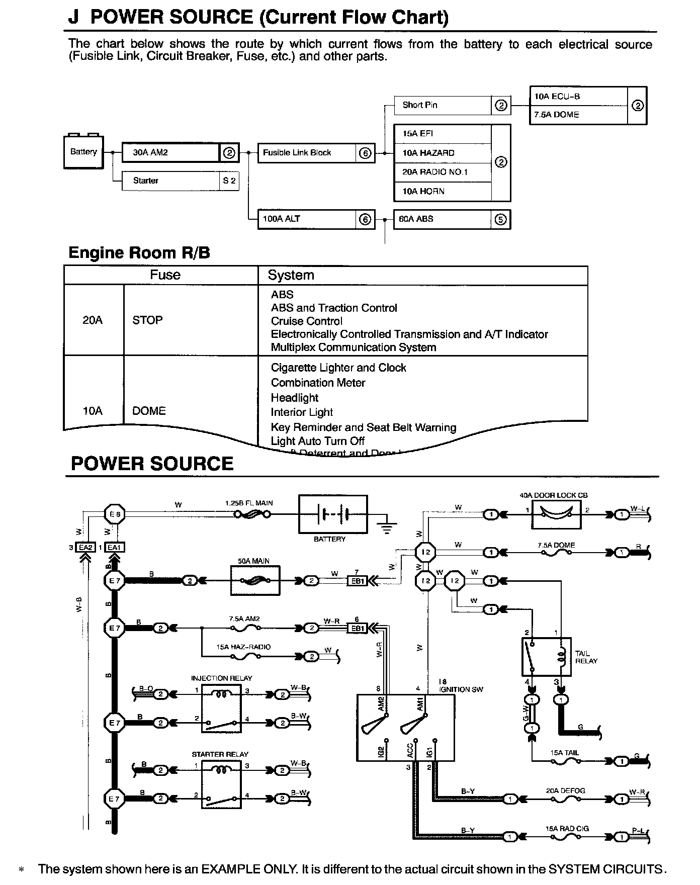 The "Current Flow Chart", describes which parts each power source (fuses, fusible links, and circuit breakers) transmits current to. In the Power Source circuit diagram, the conditions when battery power is supplied to each system are explained. Since all System Circuit diagrams start from the power source, the power source system must be fully understood.