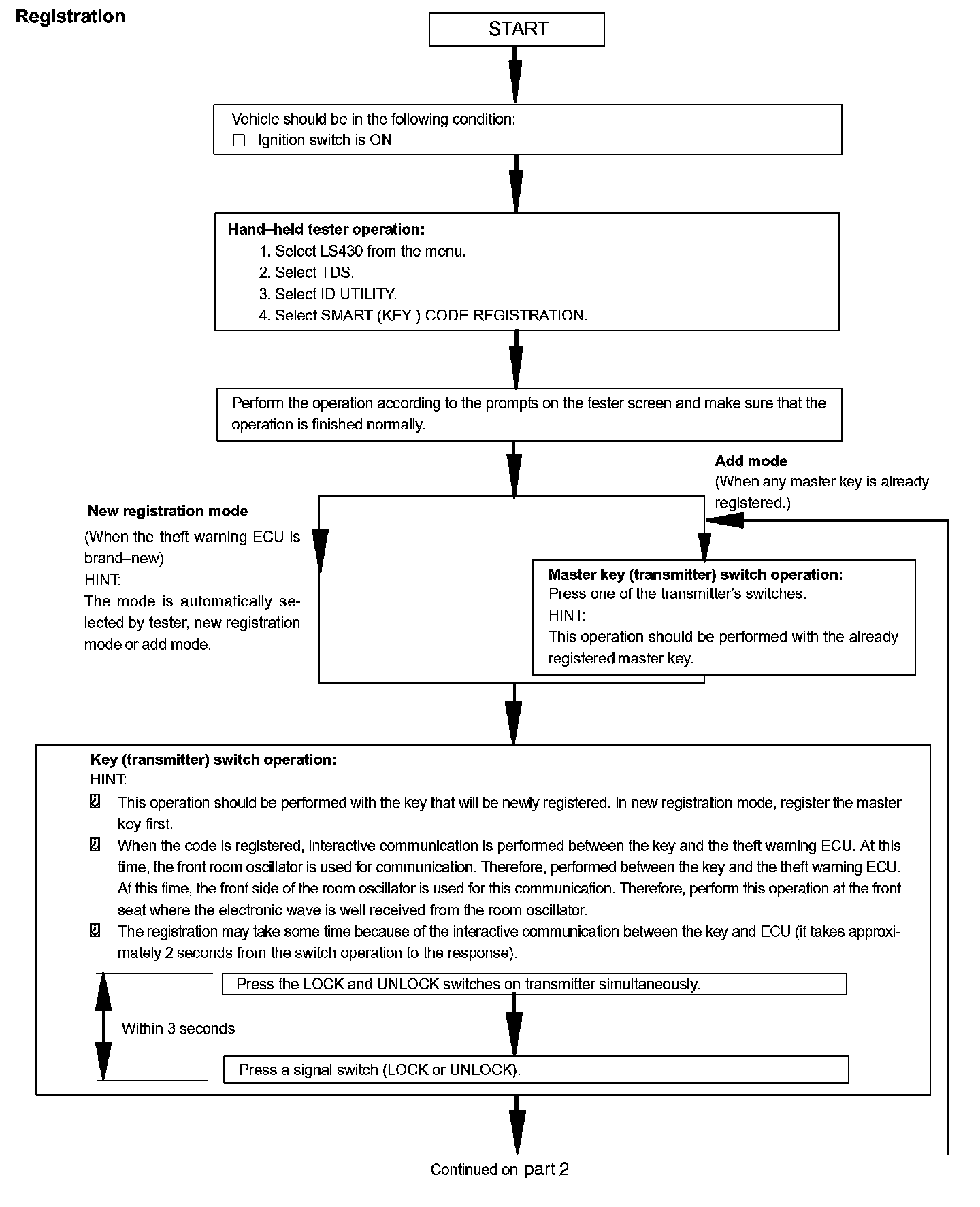 The new registration mode is used when the theft warning ECU is replaced with a new ECU. In this mode, be sure to register a master key code first. Otherwise, you cannot proceed to the add mode for registering other keys. If a sub key code is registered first, pressing one of the transmitter's switches (master key (transmitter) switch operation in the add mode*) to try to make an additional key registration erases the registered sub key code.