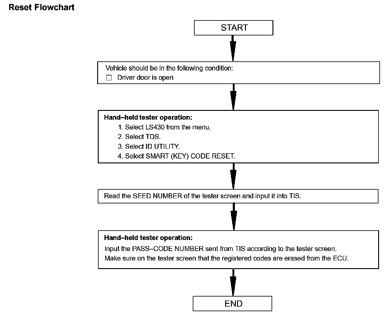 - A brief outline of procedures for key code reset is shown. For more detailed information, please refer to the hand-held tester screen's instruction.