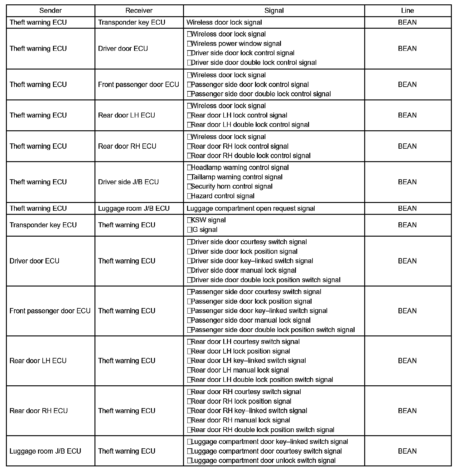 The theft warning ECU receives door control transmitter door LOCK/UNLOCK switch signals through the serial communication line. It sends door LOCK/UNLOCK control signals to each seat's door ECU through the multiplex communication line.
