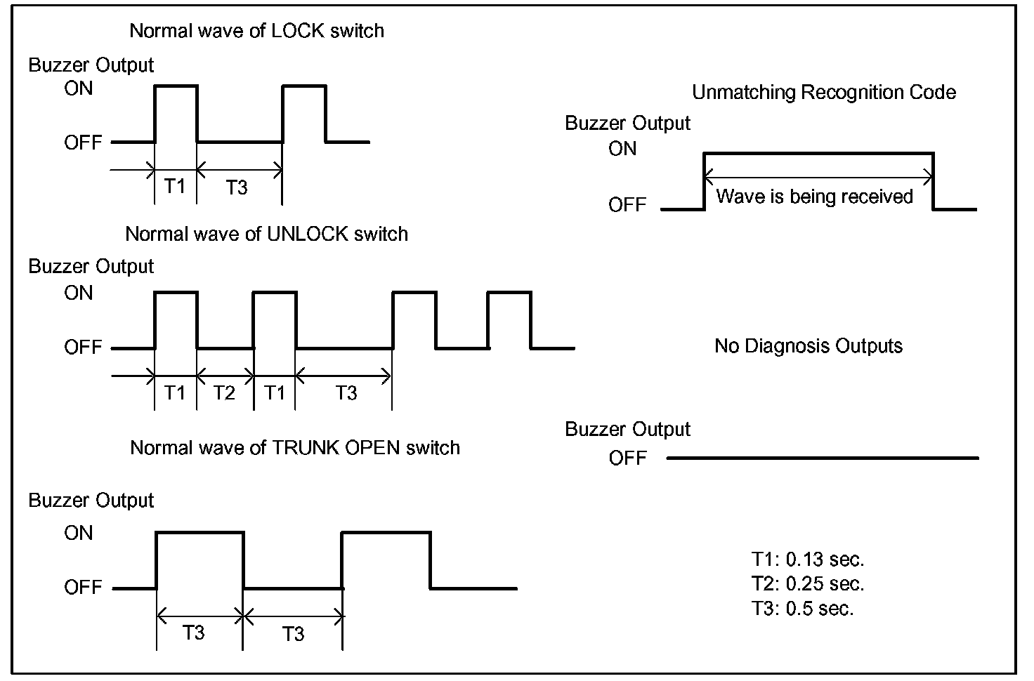 c. Inspect the diagnosis outputs when the door control transmitter switch is held down (the diagnosis outputs can be checked with the sound of the wireless door lock buzzer).