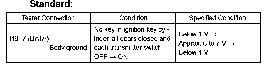 HINT: This mode checks signal transmission/reception between the door control transmitter, door control receiver and theft warning ECU (theft deterrent ECU). If all of customer's door control transmitters do not function, it is possible the door control transmitter(s) and/or wire harness is malfunctioning.