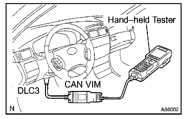 HINT: Connect the cable of the hand-held tester (with CAN VIM) to the DLC3, turn the ignition switch ON and attempt to use the hand-held tester. If the screen displays the message UNABLE TO CONNECT TO VEHICLE, there is a problem either with the vehicle or with the tester.