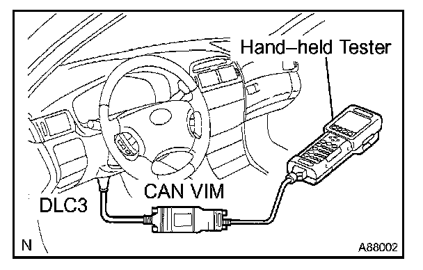 HINT: Connect the cable of the hand-held tester (with CAN VIM) to the DLC3, turn the ignition switch ON and attempt to use the hand-held tester. If the screen displays the message UNABLE TO CONNECT TO VEHICLE, there is a problem either with the vehicle or with the tester.