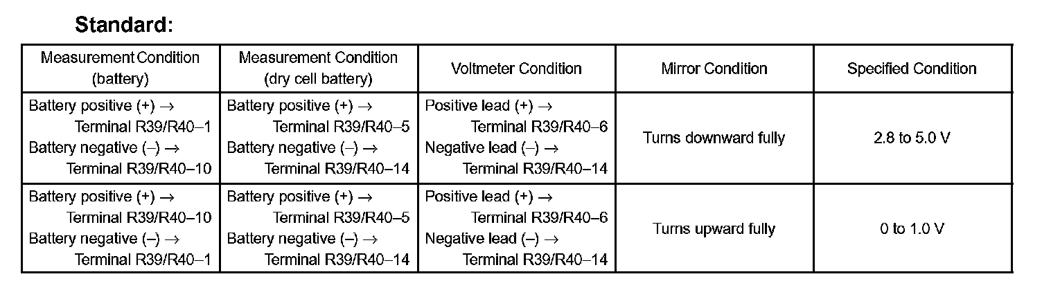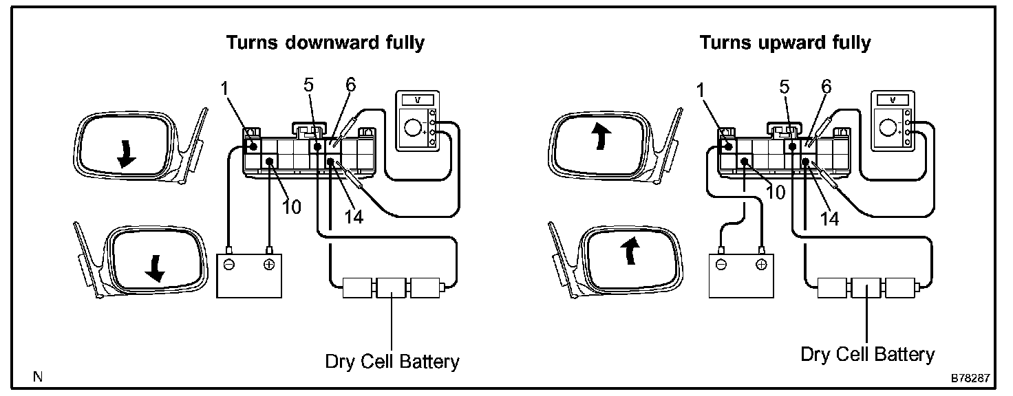 2. Measure the voltage while the mirror moves between the fully turned downward position and fully turned upward position.