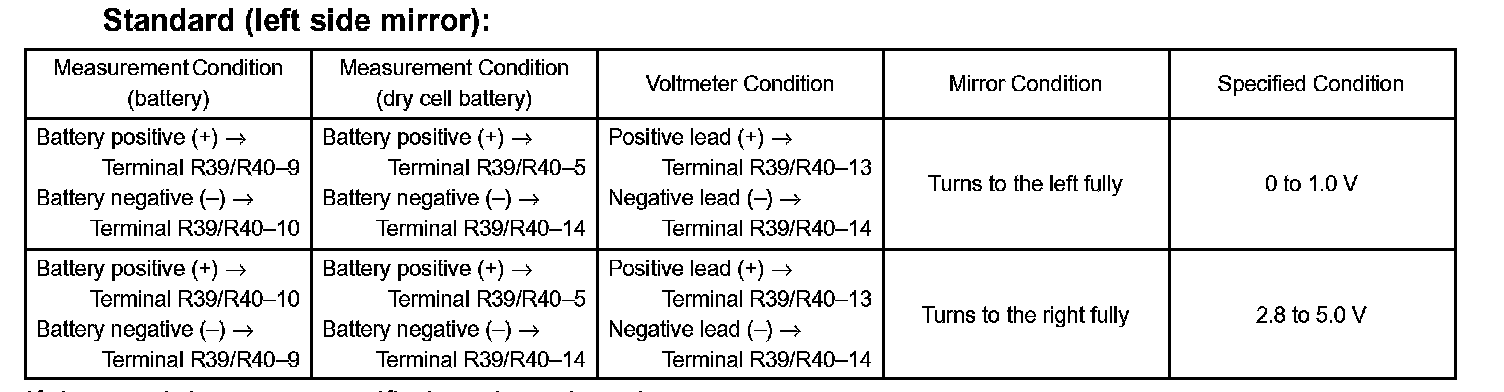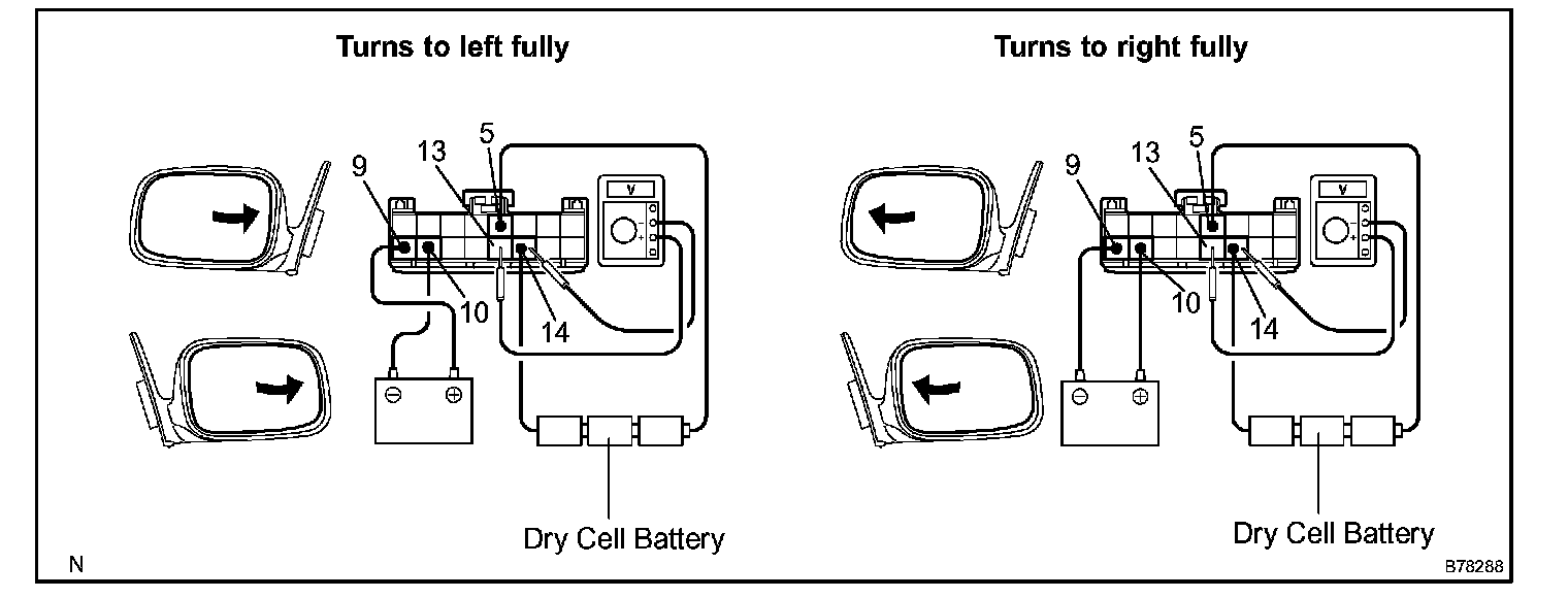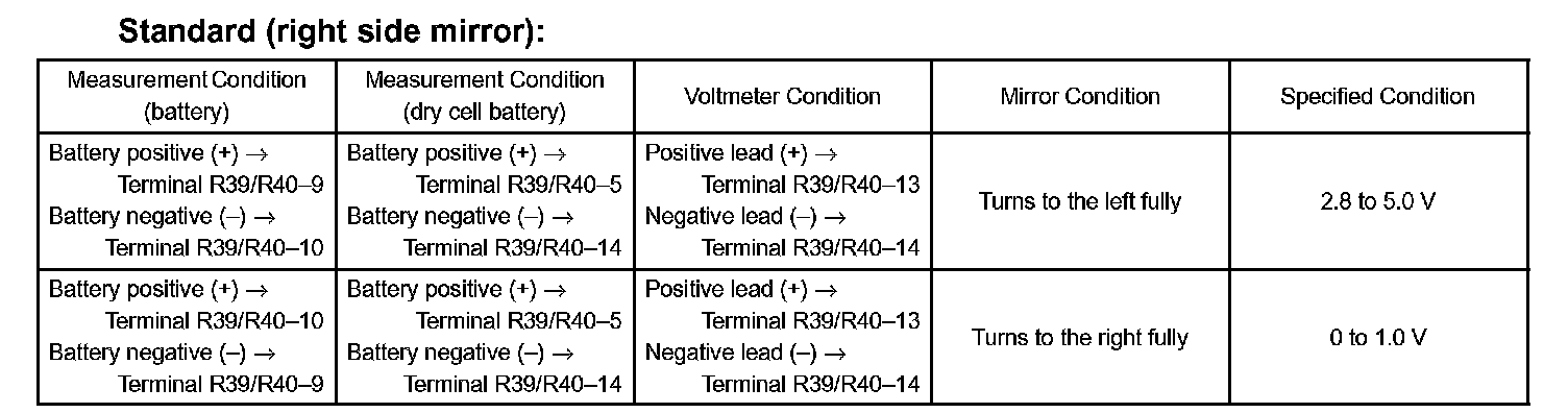 3. Measure the voltage while the mirror moves between the fully turned to the left position and fully turned to the right position.
