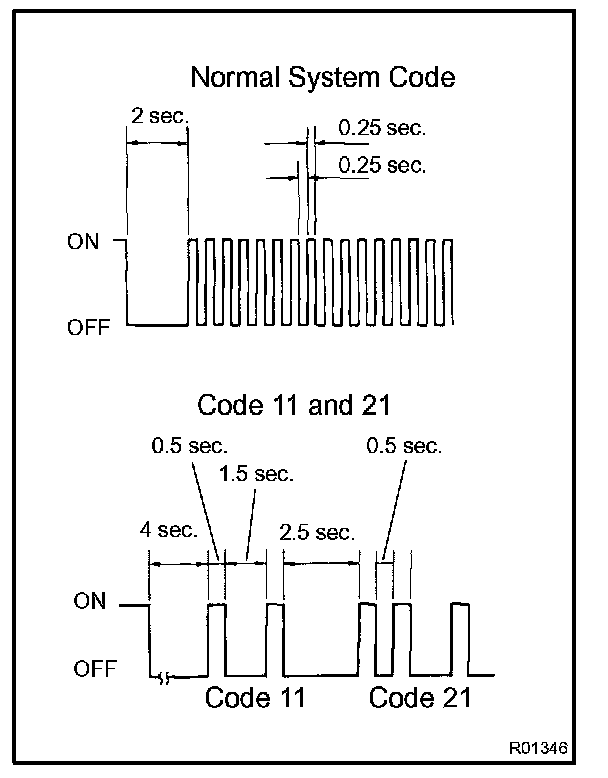 - As an example, the blinking patterns for a normal system code and trouble codes 11 and 21 are shown.