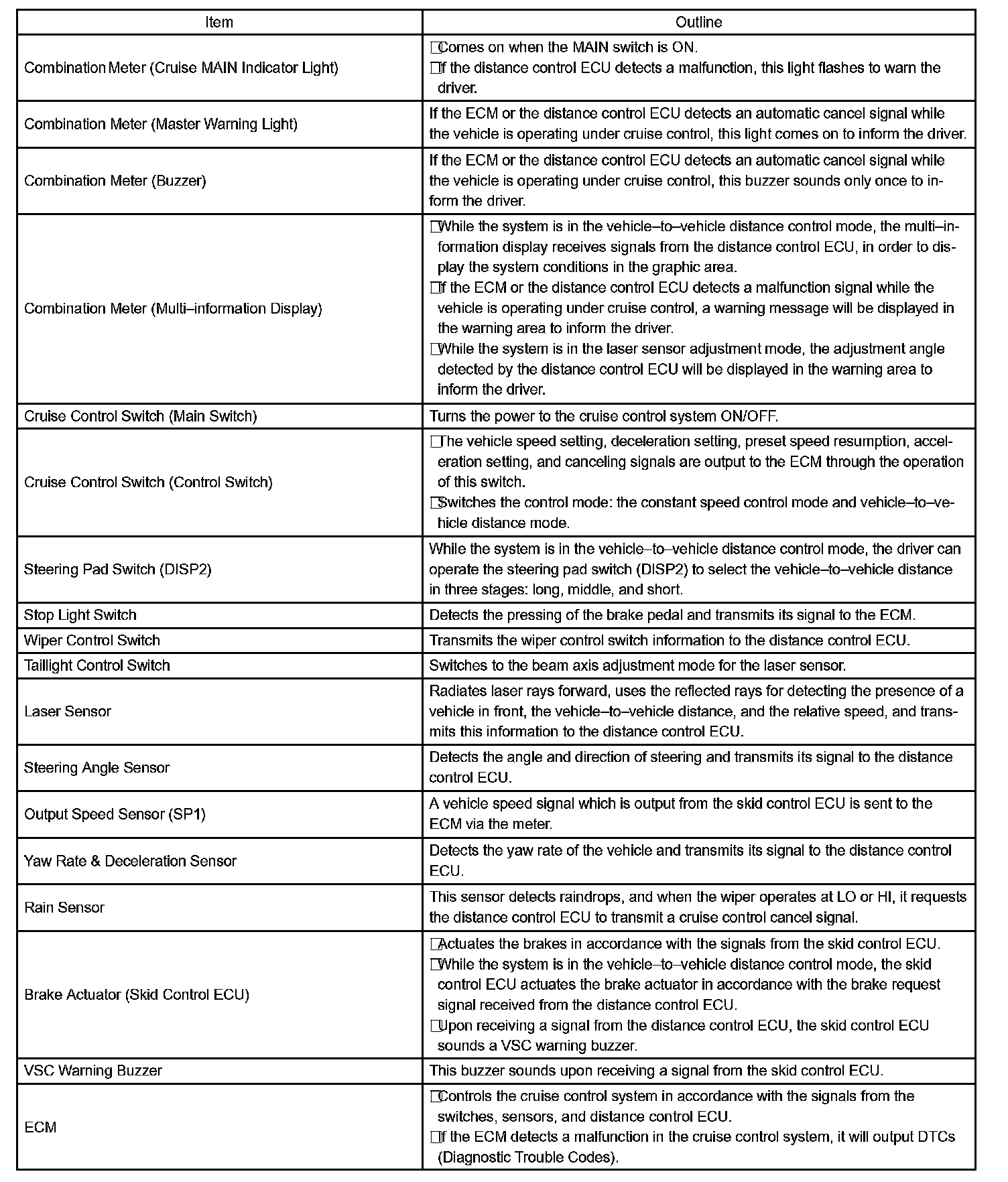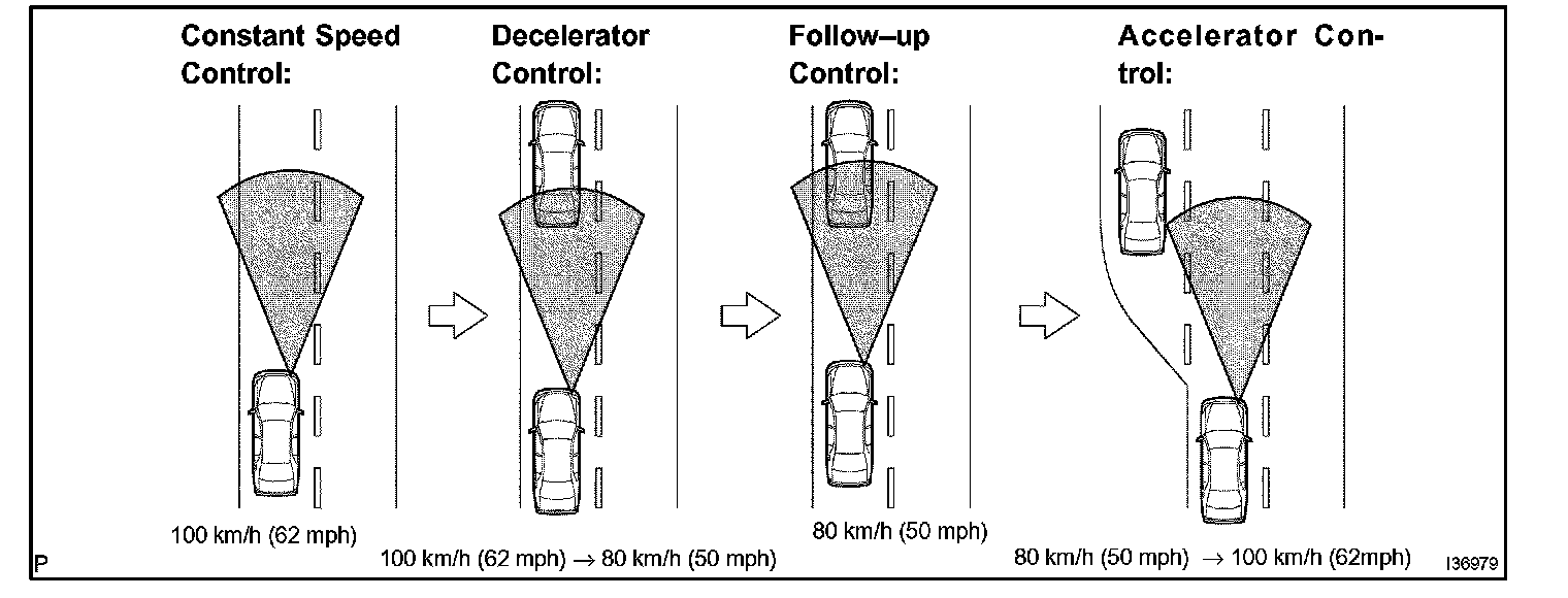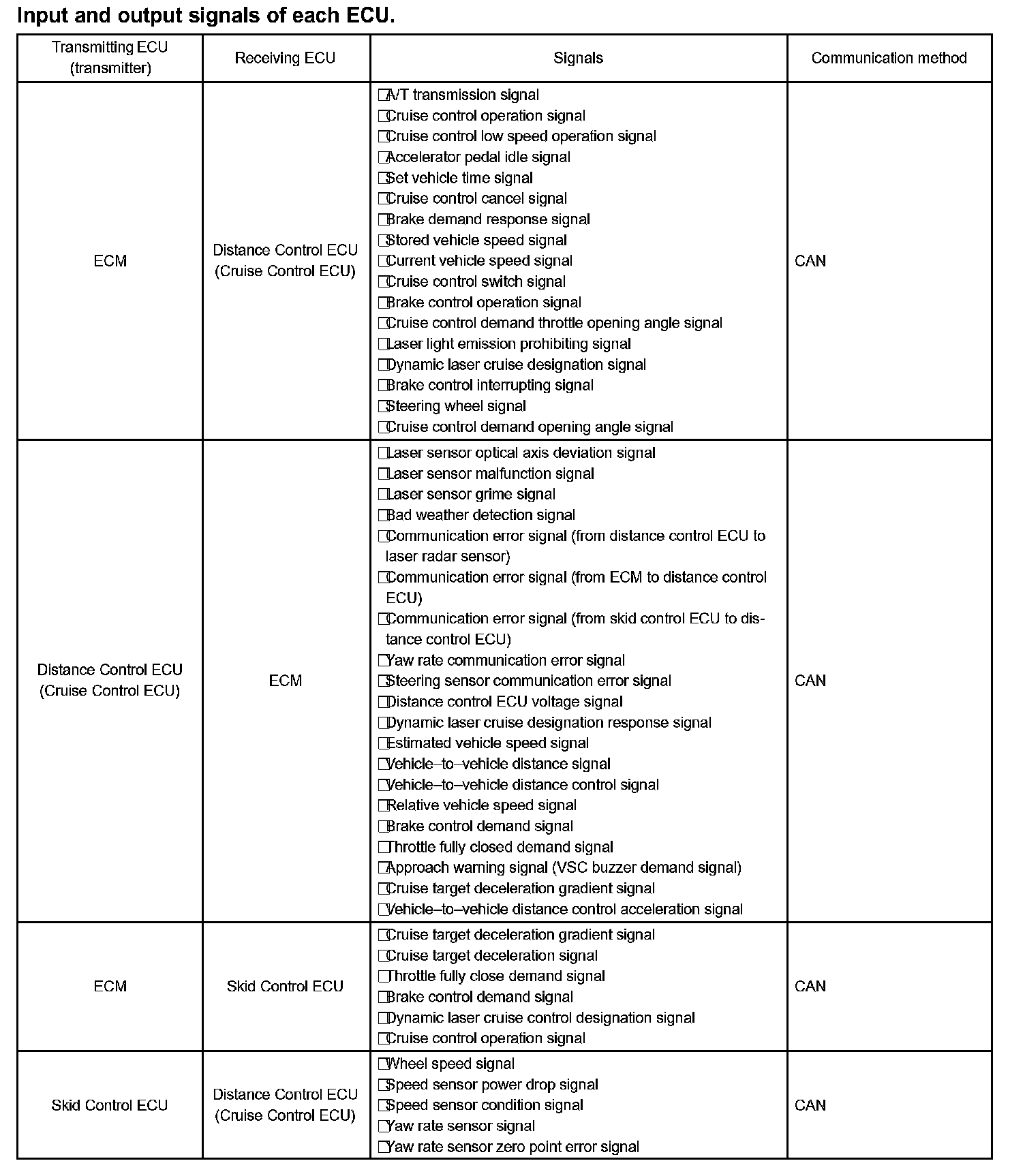 The distance control ECU (cruise control ECU) determines the distance between a vehicle in front and your own, relative speed, target decreasing speed and deceleration rate to transmit a brake demand signal to the skid control ECU via ECM.