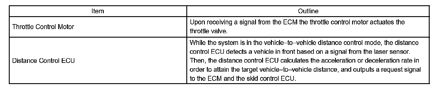 d. The laser sensor and the distance control ECU (cruise control ECU) control the system while the vehicle-to-vehicle distance control mode is in operation, and send signals to each actuator and ECU.