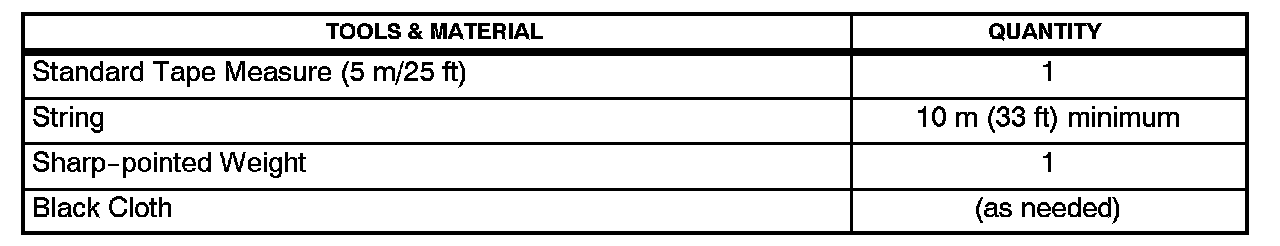 D. Prepare a 10 m (33 ft) string, a string with a sharp-pointed weight, and a 5 m (25 ft standard) tape measure.