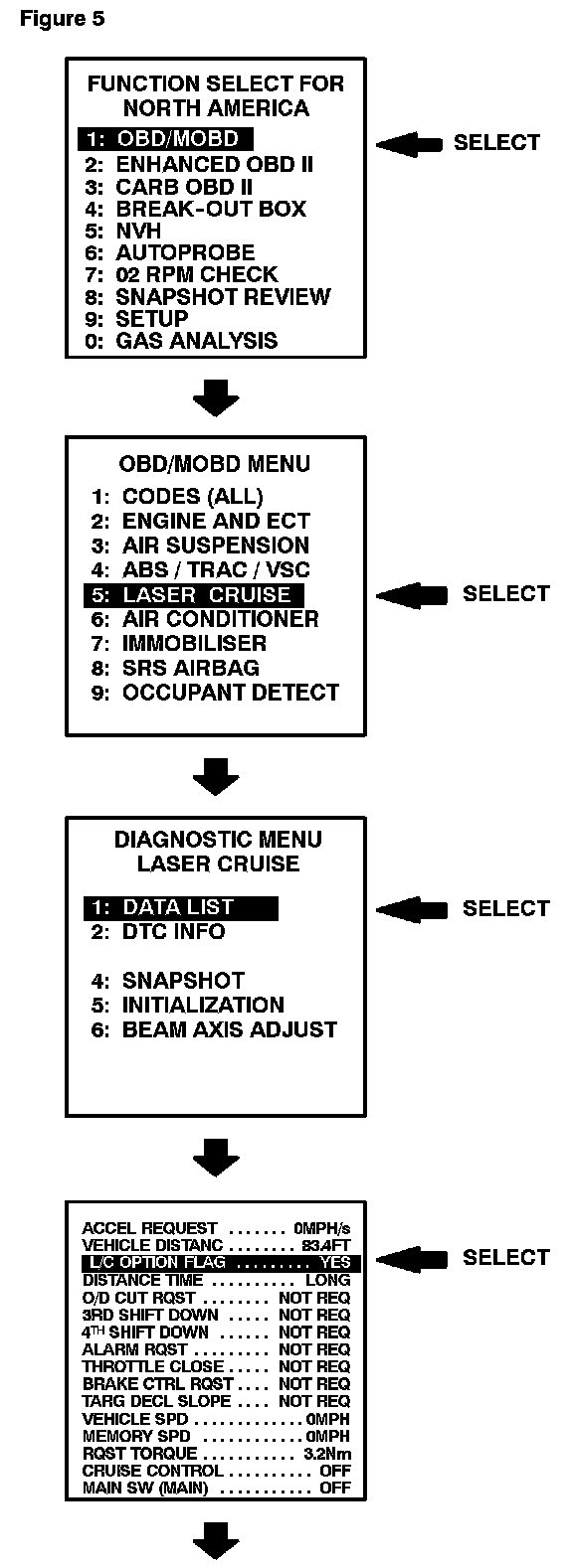 - If the L/C Option Flag is NOT set to "YES" in the Data List after performing the L/C Option Flag selection procedure and the beep is heard, perform the "INITIALIZATION" option from the "LASER CRUISE" menu on the Diagnostic Tester.