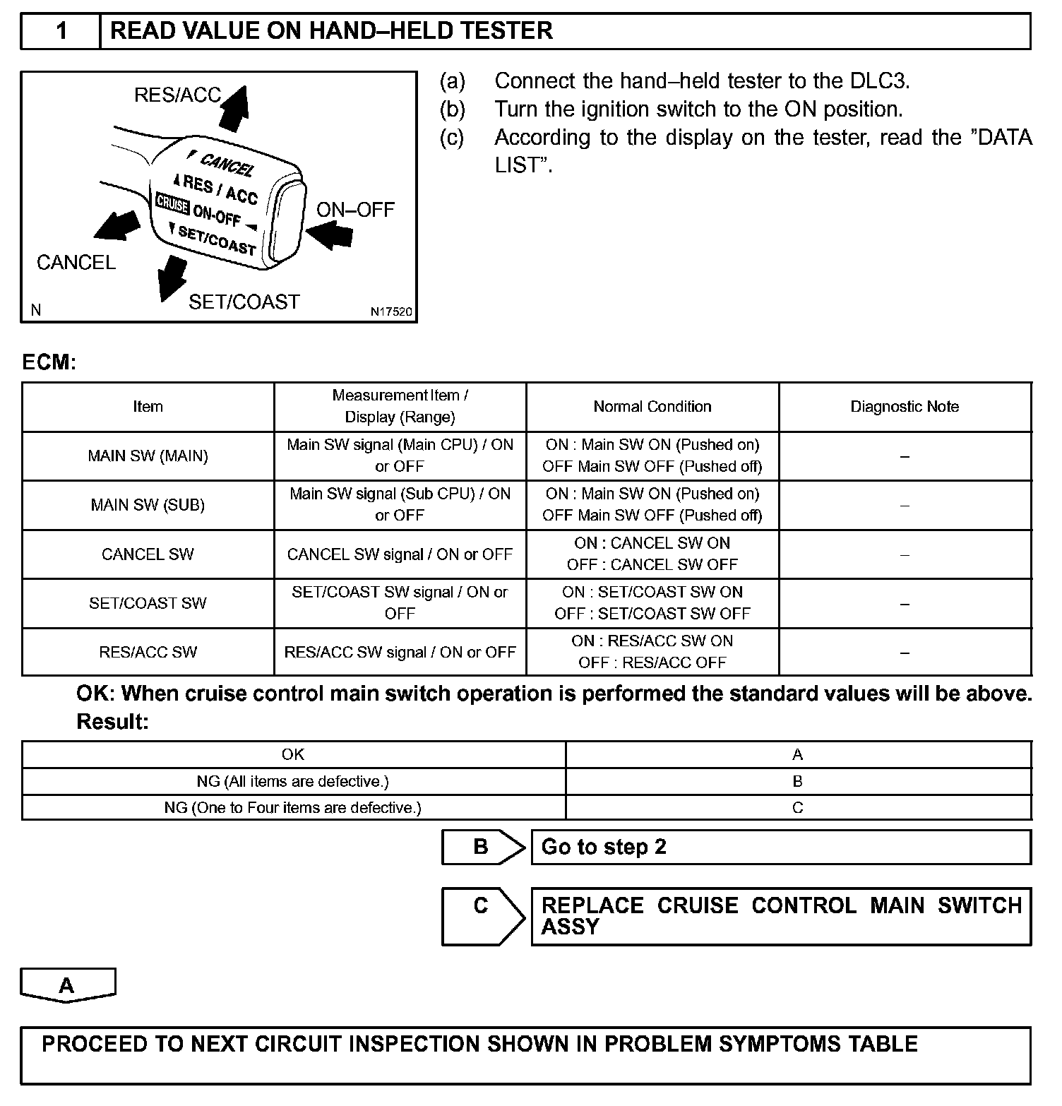 The cruise control main switch operates seven functions: SET, COAST, TAP-DOWN, RESUME, ACCEL, TAP-UP, and CANCEL. The SET, TAP-DOWN and COAST functions, and the RESUME, TAP-UP and ACCEL functions are operated with the same switch respectively. The cruise control main switch is an automatic return type switch which turns on only while operating it in each arrow direction and turns off after releasing it. The internal contact point of the cruise control main switch is turned on with the switch operation. Then the ECM reads the resistance value that has been changed by the switch operation to control SET, COAST, RESUME, ACCEL and CANCEL.