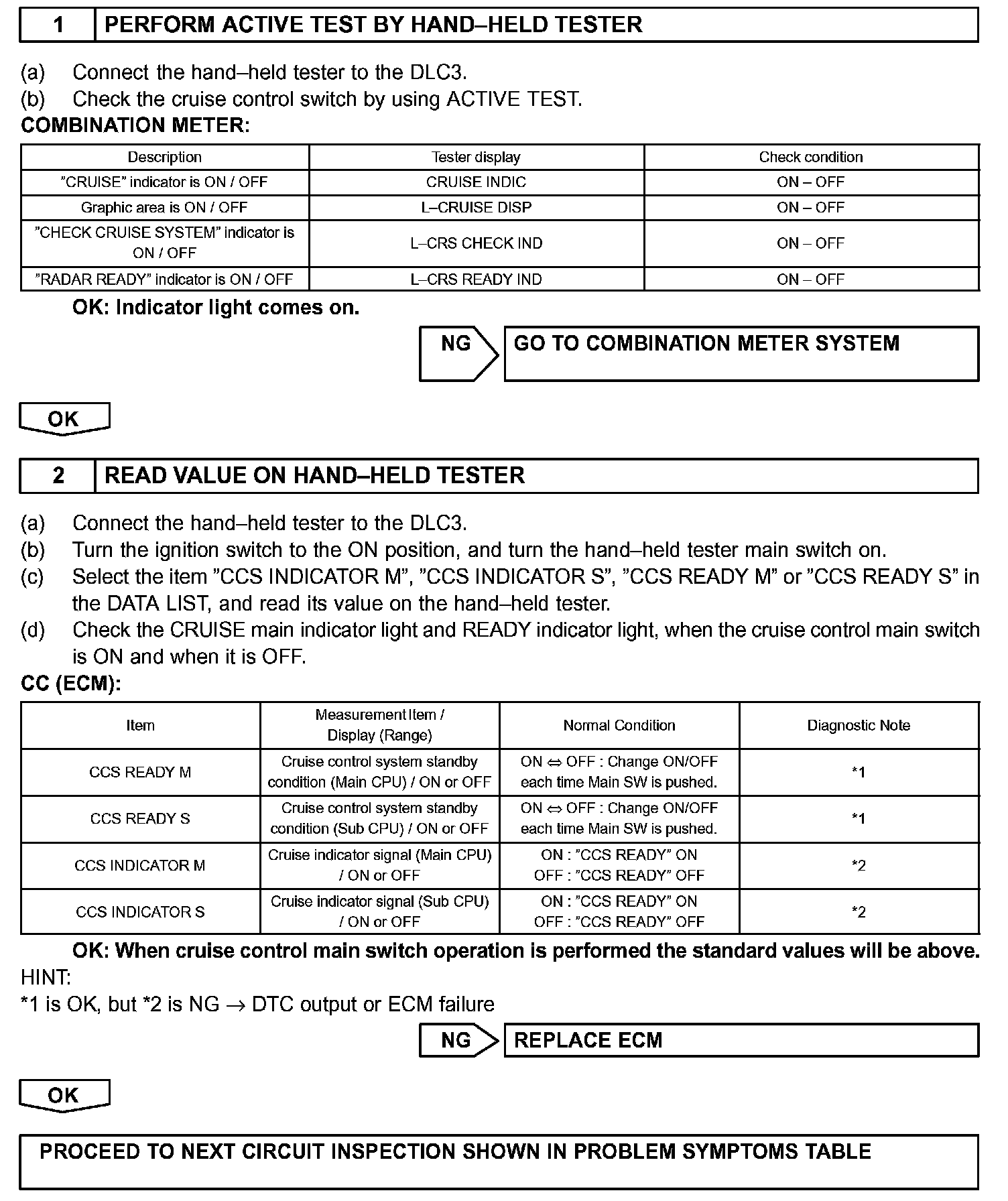 Items such as "Clean Radar Sensor", "Cruise not Available", "Check Cruise System" and "Radar Cruise Ready" are displayed in the multi-information display on the combination meter when the ECM detects signals from each sensor and actuator and sends them to the combination meter via CAN and BEAN.