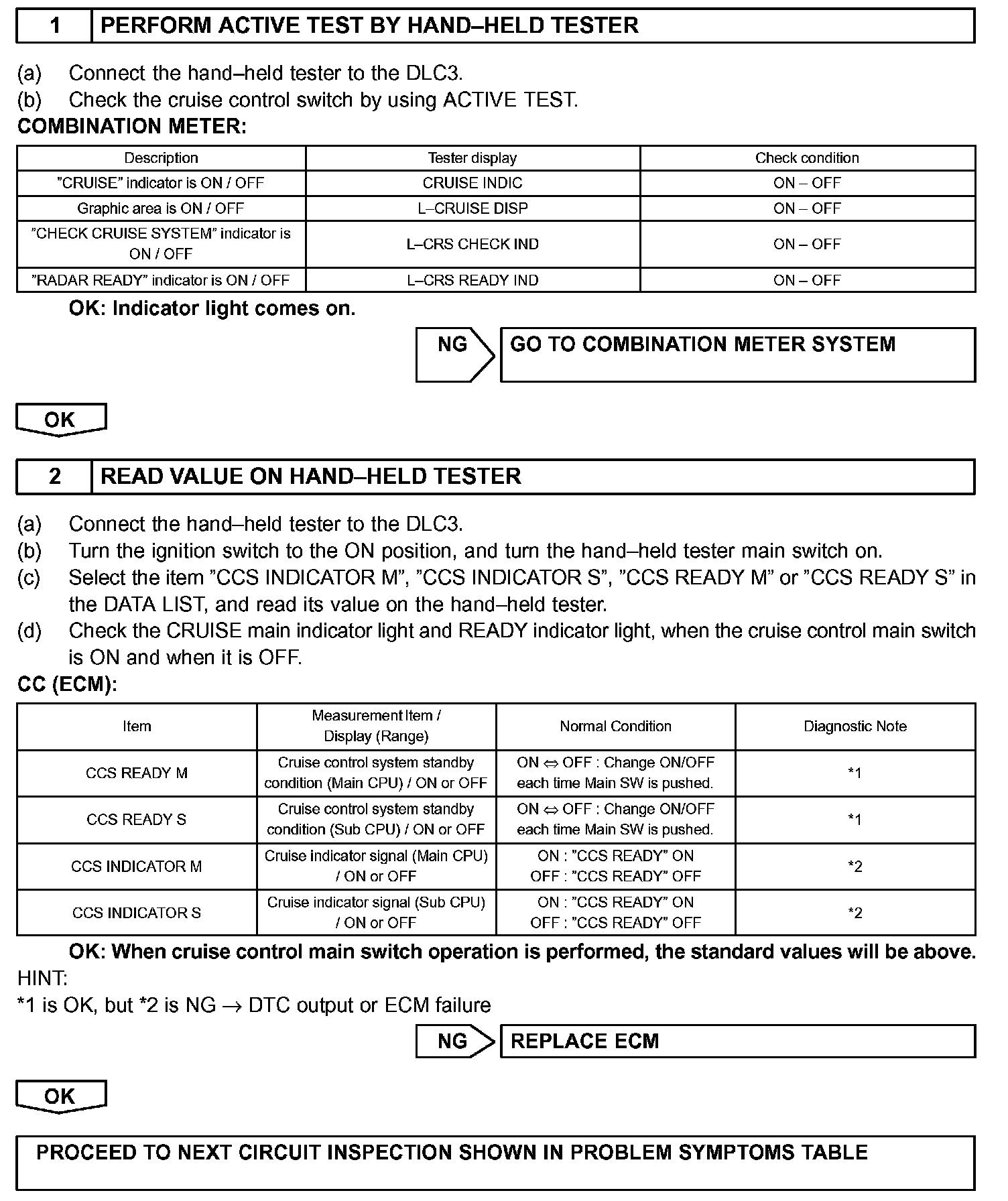 Each indicator in the dynamic laser cruise control uses CAN and BEAN for communication. Therefore if there are any malfunctions in this circuit, check for DTCs in the CAN communication and multiplex communication systems.