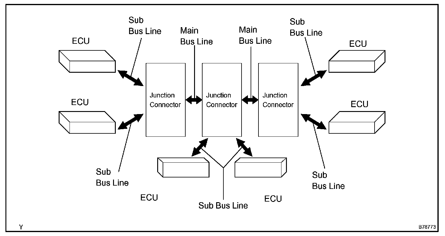 - The CAN uses the multi star style bus connection. The 3 junction connectors are connected with a main bus line. The junction connector extends a sub bus line and enables communication between all the connected ECUs.