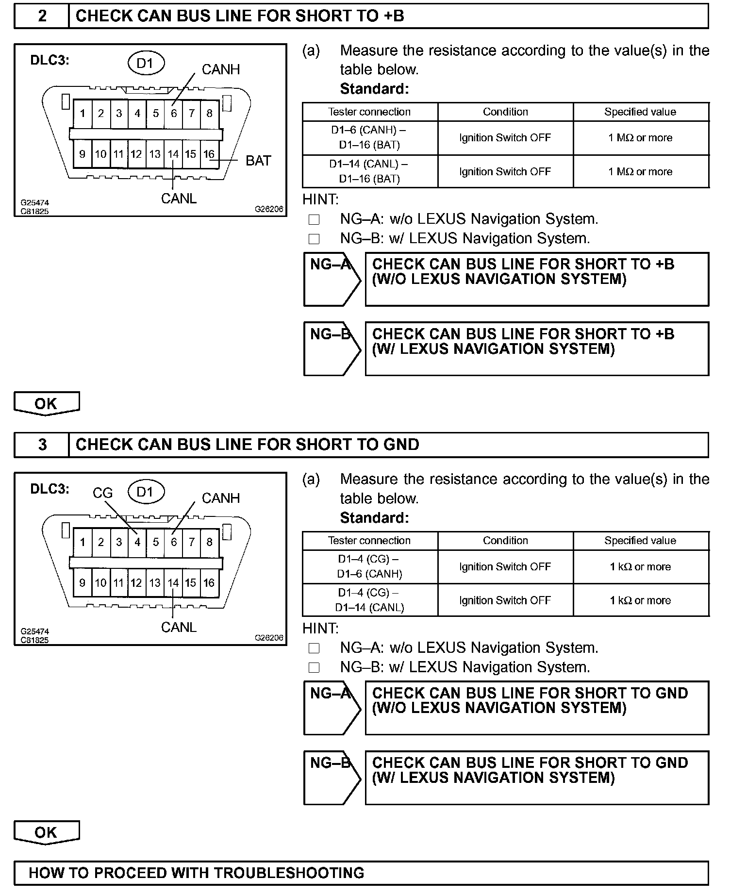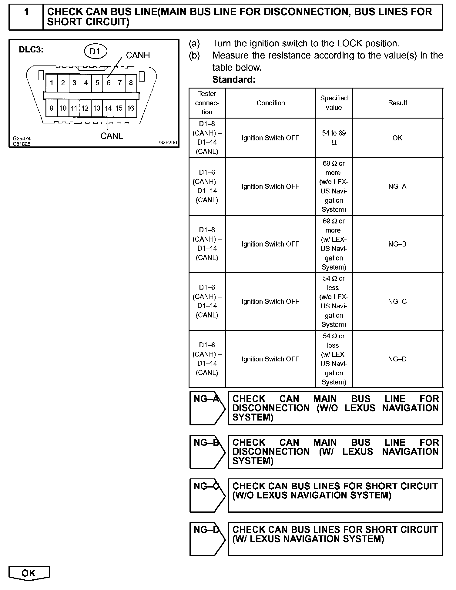 When any DTC for the CAN communication system is output, first measure the resistance between the terminals of the DLC3 to specify the trouble area, and check that there is no short in the CAN main bus line, between the CAN bus lines, to +B, or to GND.