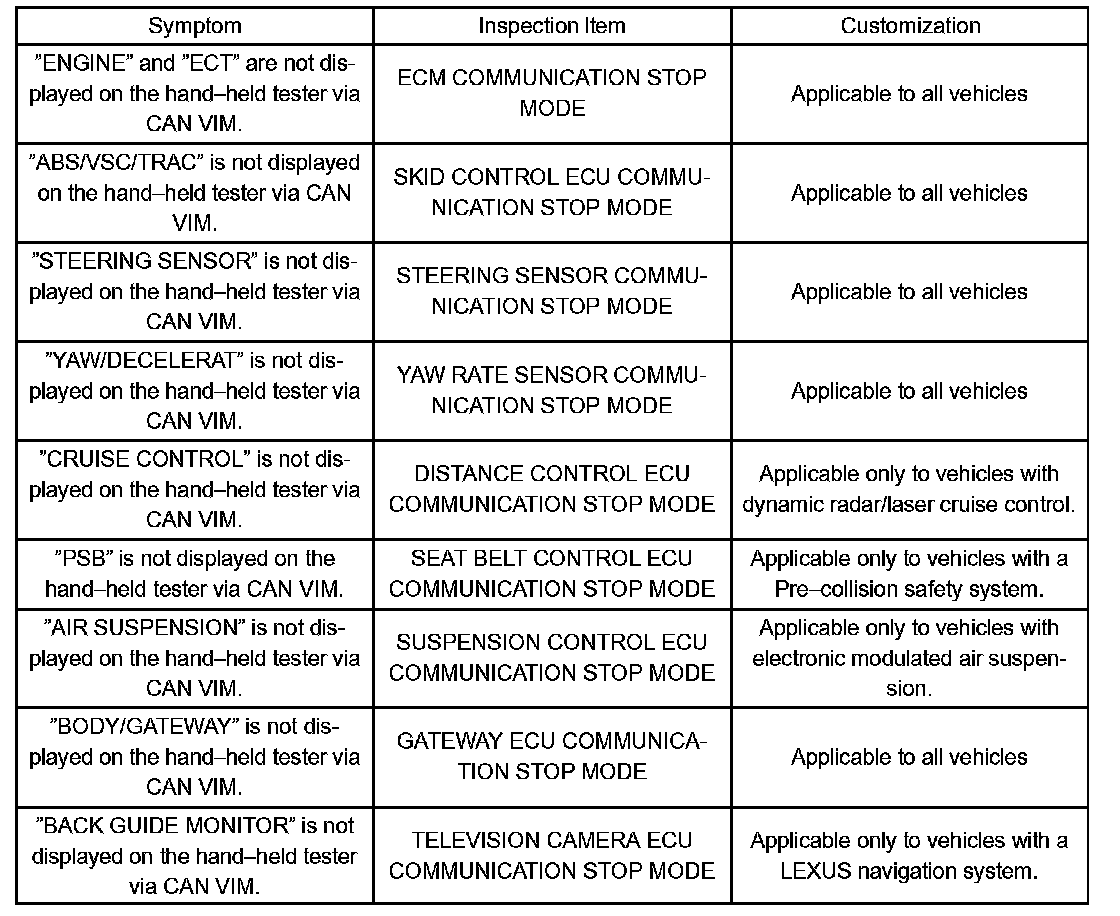 b. Check the communication stop mode of the ECUs or sensors not displayed among the following: "ENGINE", "ECT", "CRUISE CONTROL", "ABS/VSC/TRAC", "YAW/DECELERATE", "STEERING SENSOR", "BODY/GATEWAY", "BACK GUIDE MONITOR", "PSB" or "AIR SUSPENSION".