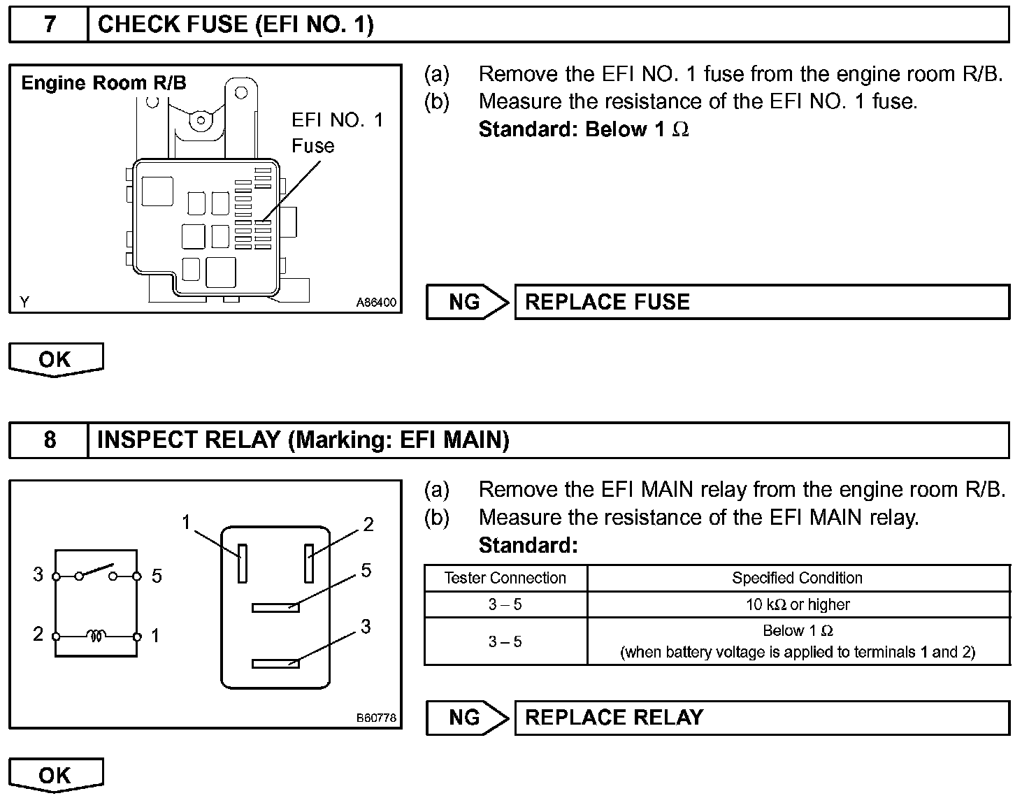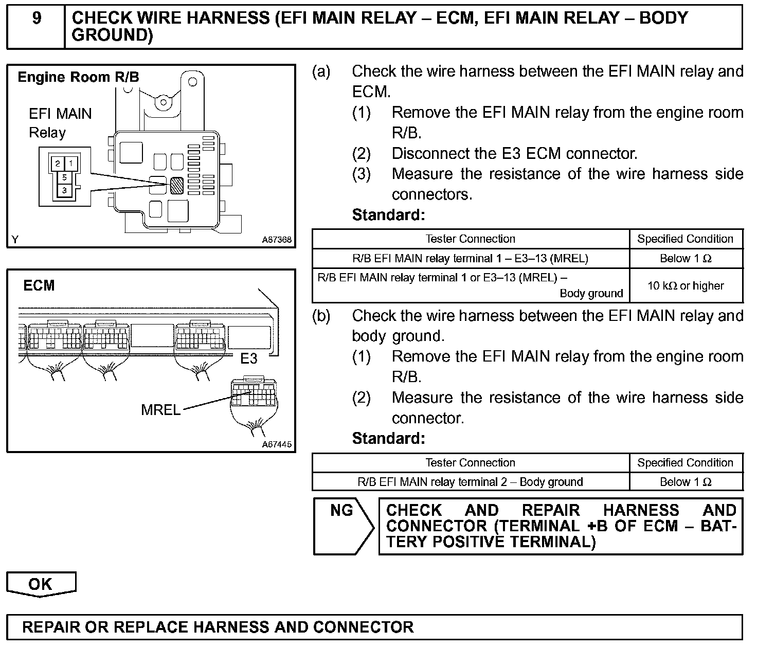When the ignition switch is turned ON, battery voltage is applied to terminal IGSW of the ECM. The ECM "MREL" output signal causes current to flow to the coil, closing the contacts of the EFI MAIN relay and supplying power to terminal +B of the ECM.