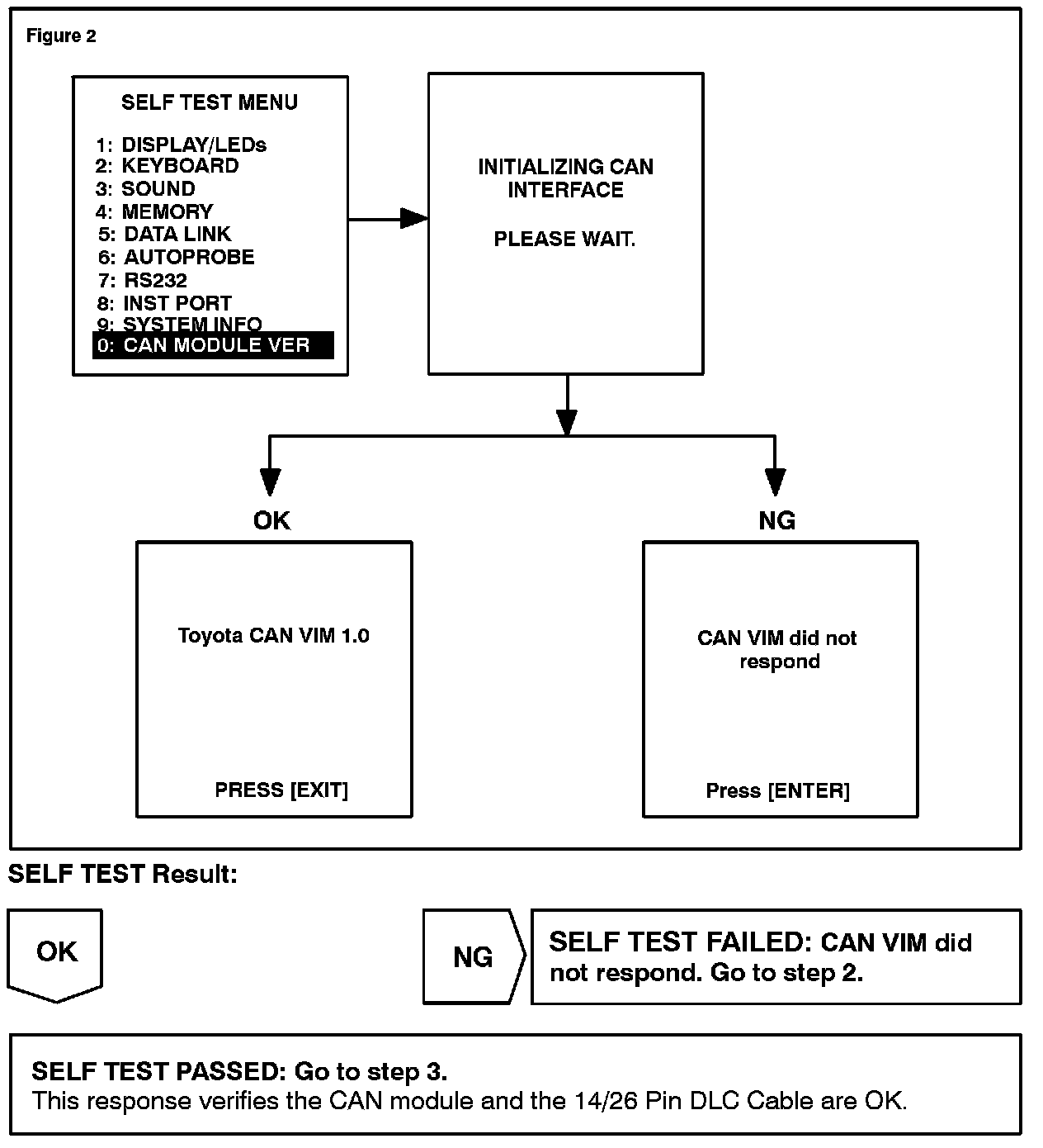 1. Using the Diagnostic Tester, perform the CAN MODULE VERSION self test. Select DIAGNOSIS/SETUP/SELF TEST and perform the screen flow shown.