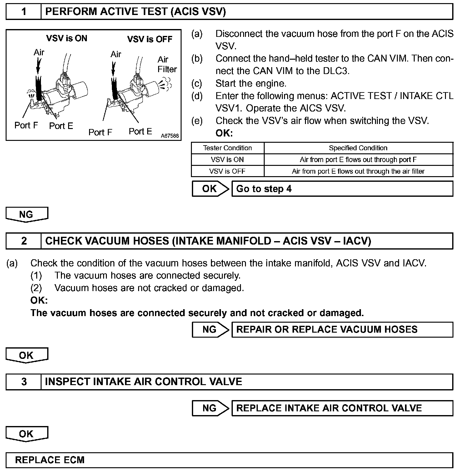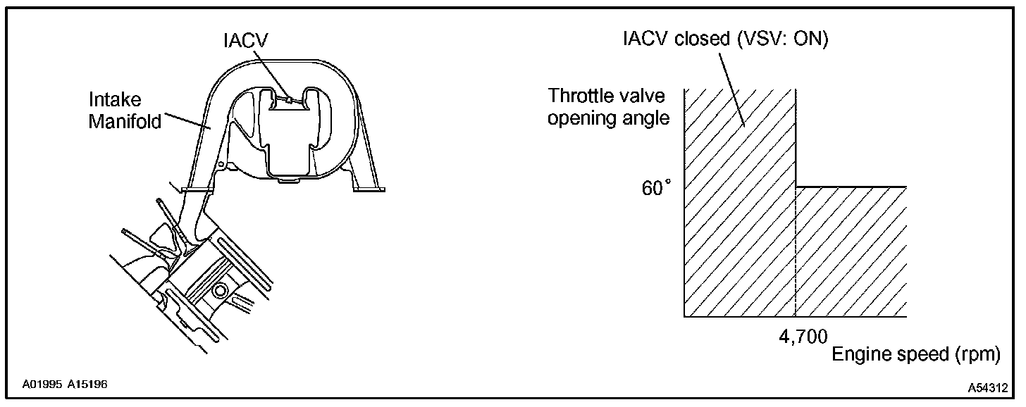 When the engine speed is 4,700 rpm or more and the throttle valve opening angle is 60 ° or more, the IACV is open (VSV: OFF). At all other times, the IACV is closed (VSV: ON).