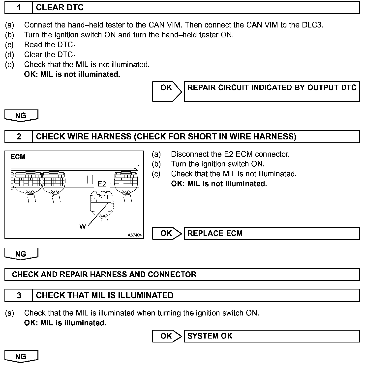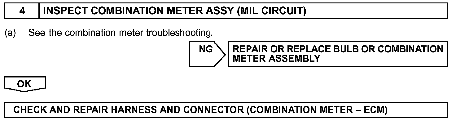 If the ECM detects trouble, the MIL illuminates. At this time, the ECM records a DTC in the memory.