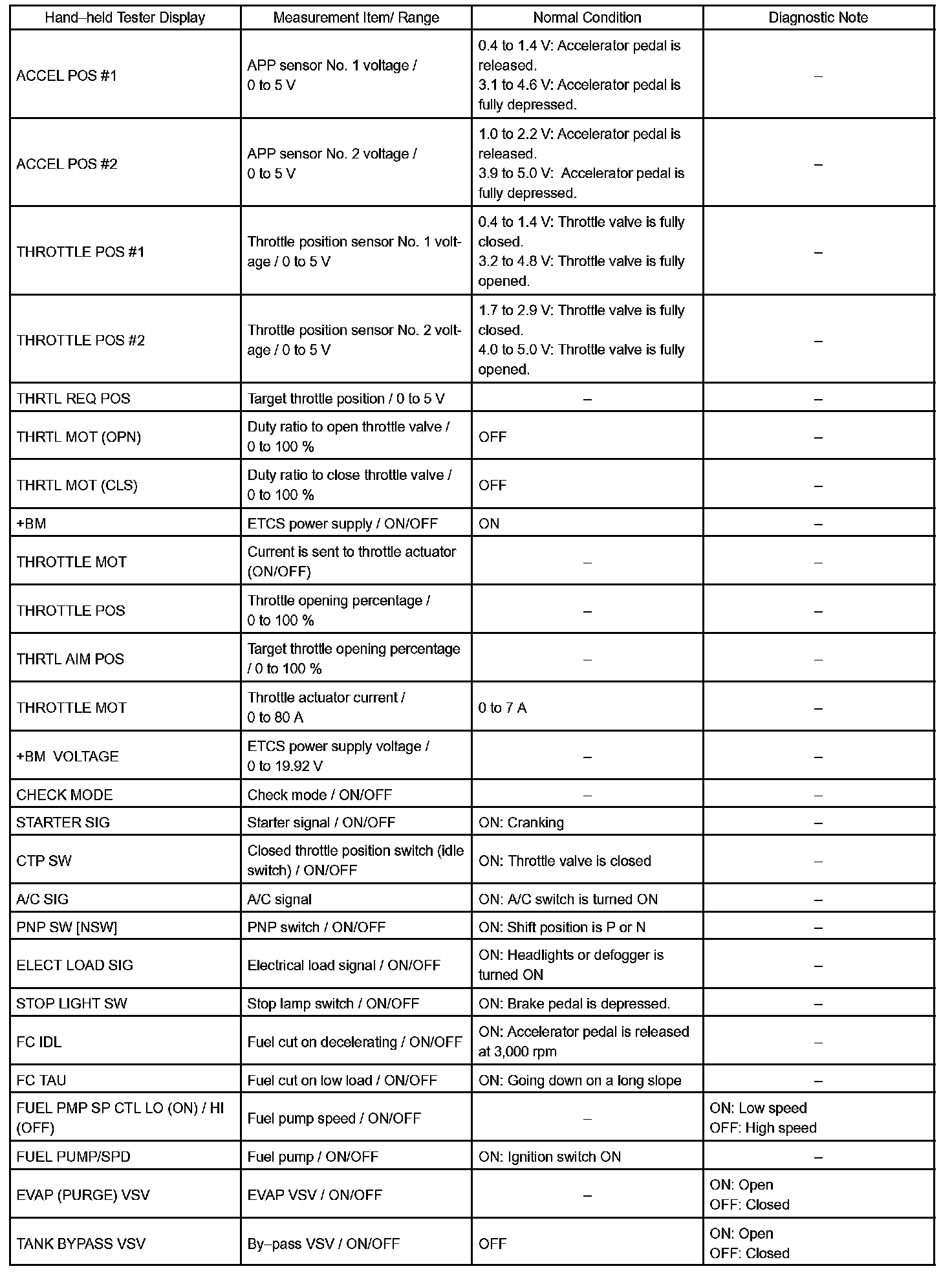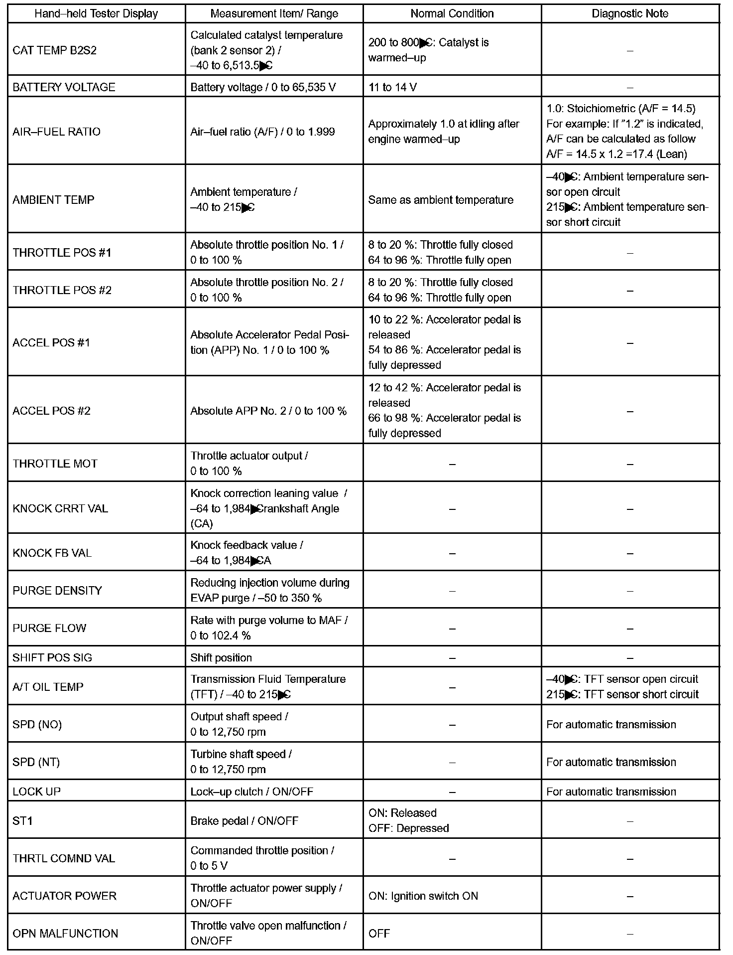 DATA LISTHINT: Using the hand-held tester's DATA LIST allows switch, sensor, actuator and other item values to be read without removing any parts. Reading the DATA LIST early in troubleshooting is one way to save time.