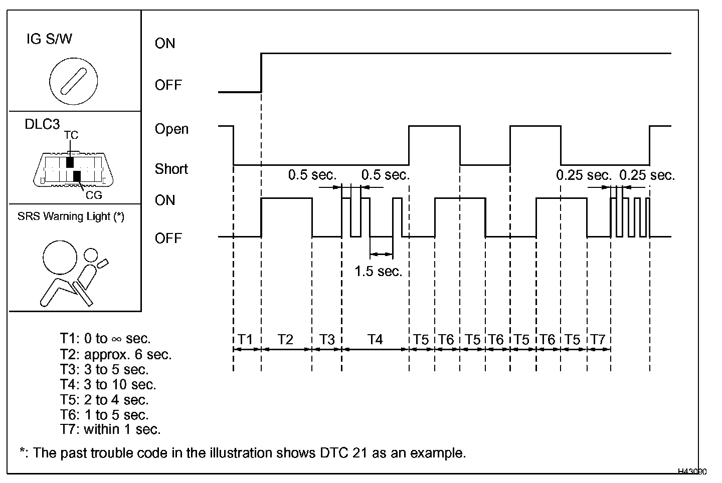 7. Check if the SRS warning light goes off 2 to 4 seconds after connecting terminals TC and CG of the DLC3. Also check if the normal system code is output within 1 second after the SRS warning light goes off.