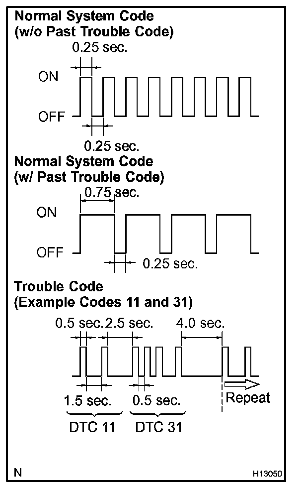 1. Read the blinking patterns of the DTCs. Examples, the blinking patterns for the normal system code and trouble codes 11 and 31 are shown in the illustration to the left.