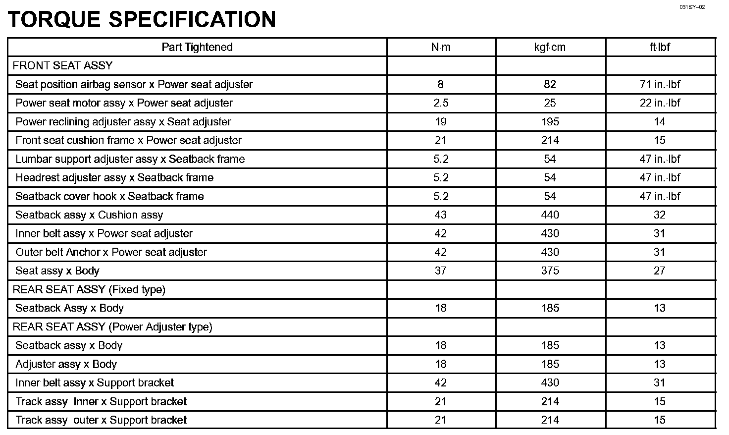 Seat - Torque Specification: