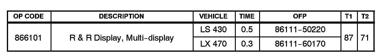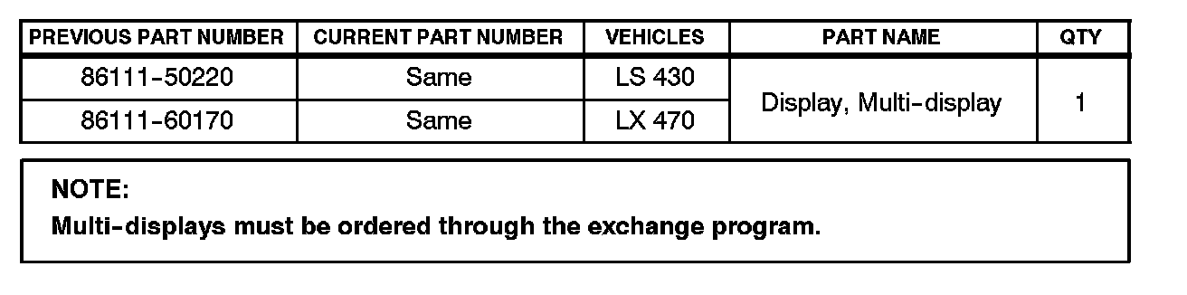 ^ For LX 470 multi-display Removal and Replacement, refer to TIS, 2004 model year GLX 470 Repair Manual: Body (Mechanical): Instrument Panel: Removal (LX470).