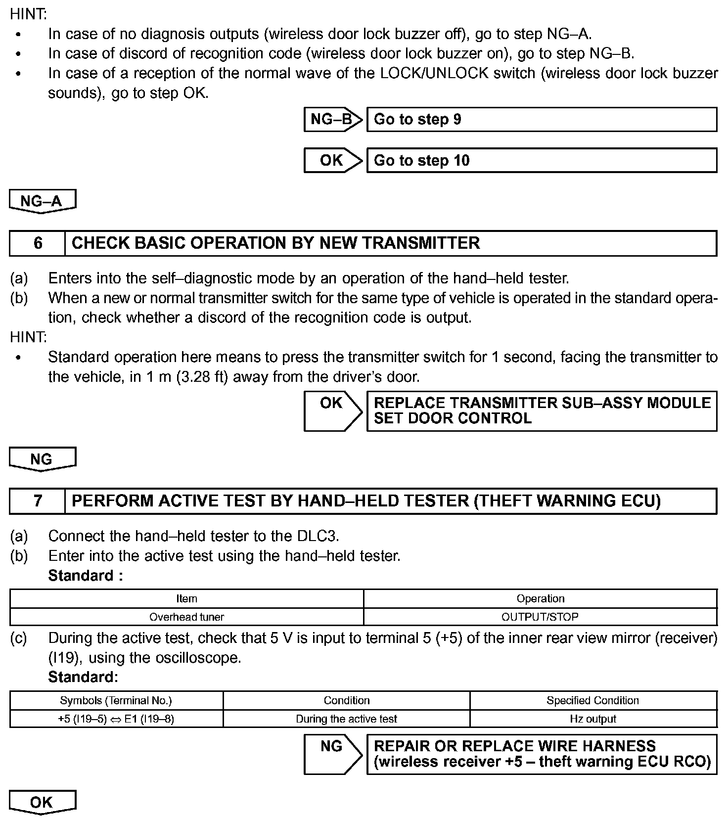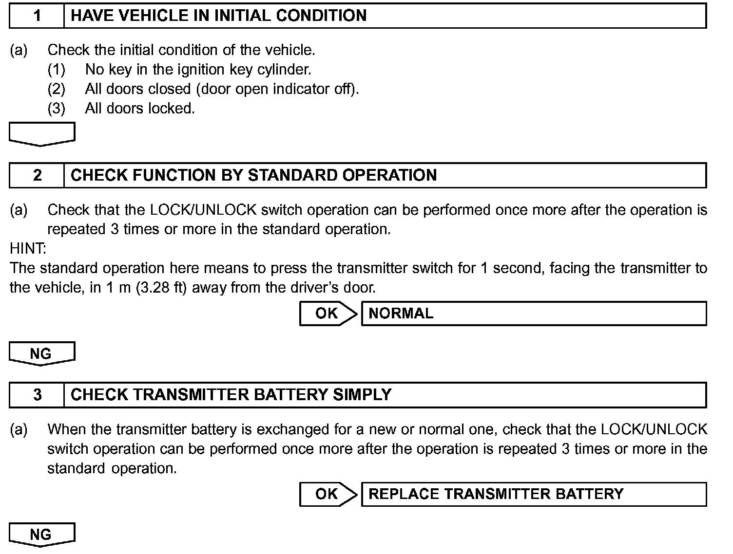 NOTE: The multiplex function control system has a function with large-scale multiplex communications. First of all, inspect the communication function depending on the HOW TO PROCEED WITH TROUBLESHOOTING, and check that there is no abnormality in the communication system. Then finally proceed with the troubleshooting. Also, when a short circuit exists in the wire harness between the theft warning ECU and the door control receiver, diagnostic trouble code DTC. B1242 is output and the wireless function does not operate.