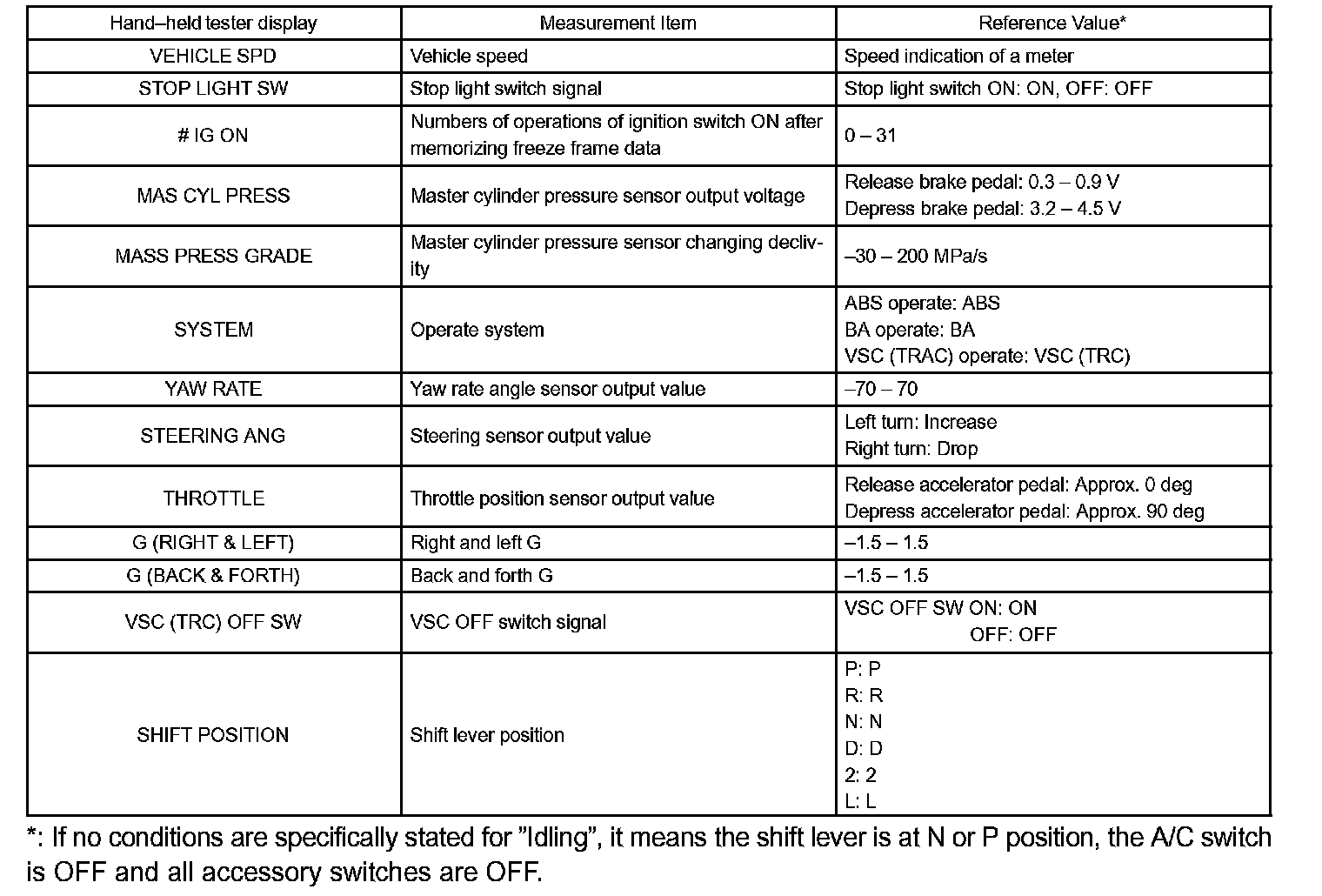 FREEZE FRAME DATAa. The vehicle (sensor) status memorized during ABS and/or VSC operation or at the time of error code detection can be displayed using the LEXUS hand-held tester.