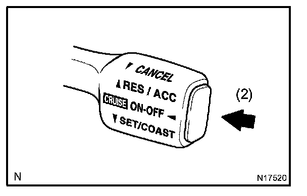 2. Check that the CRUISE MAIN indicator light comes on when the cruise control main switch ON-OFF button is pushed on, and that the indicator light goes off when the ON-OFF button is pushed off.