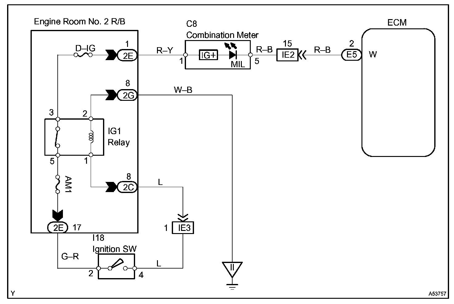 The instrument panel GAUGE fuse provides the circuit with power and the ECM provides the circuit ground that illuminates the MIL.