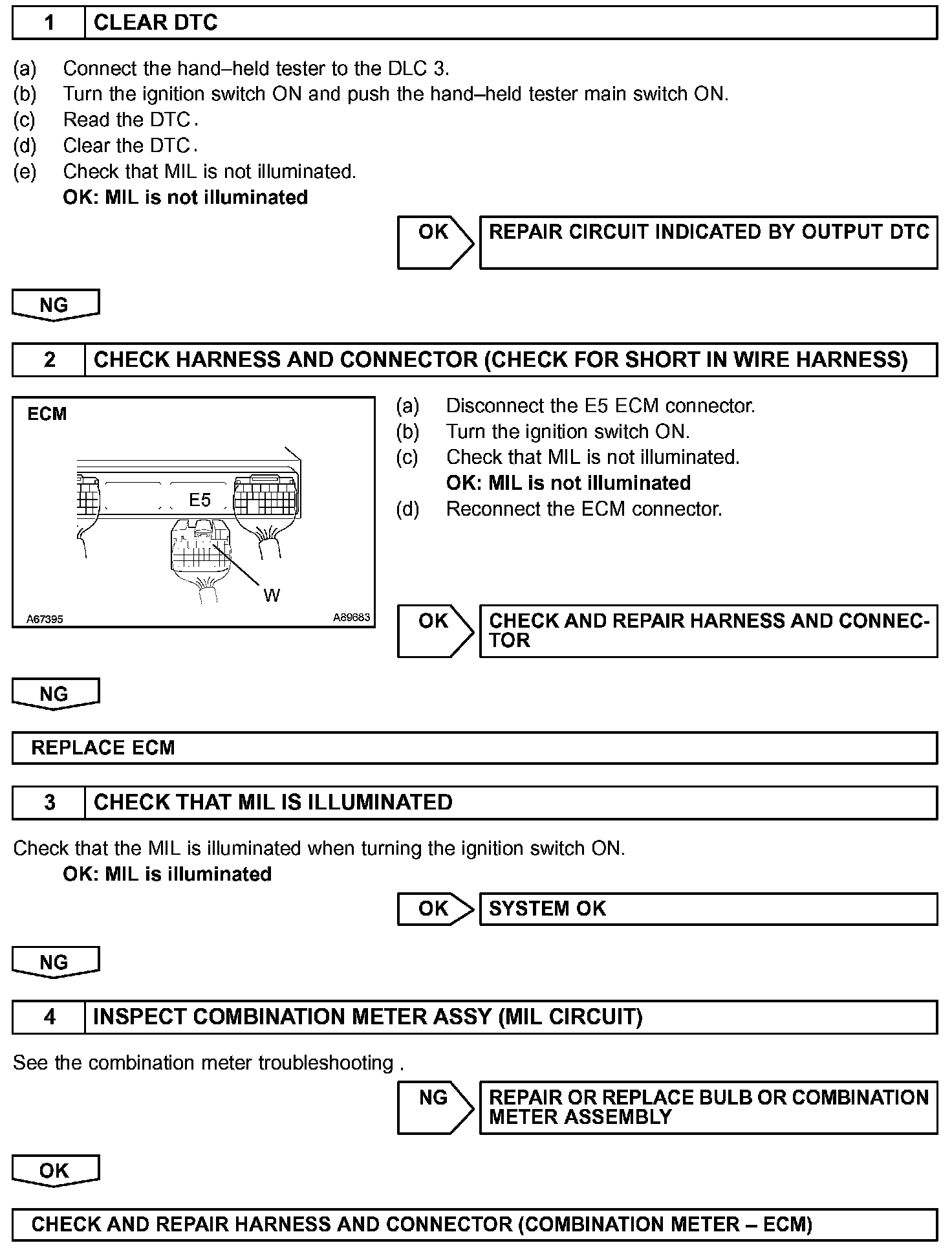If the ECM detects trouble, the MIL illuminates. At this time, the ECM records a DTC in the memory.