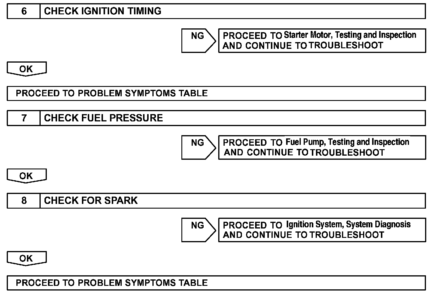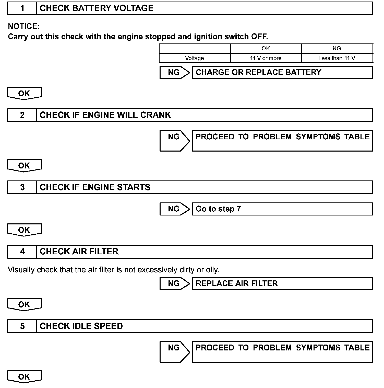 When the malfunction is not confirmed in the DTC check, troubleshooting should be carried out in all the possible circuits considered as causes of the problem. In many cases, by carrying out the basic engine check shown in the following flowchart, the location causing the problem can be found quickly and efficiently. Therefore, using this check is essential in the engine troubleshooting.