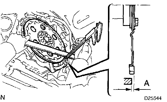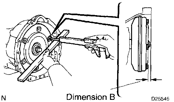 b. Using calipers and a straight edge, measure dimension A between the transmission and the end surface of the drive plate.