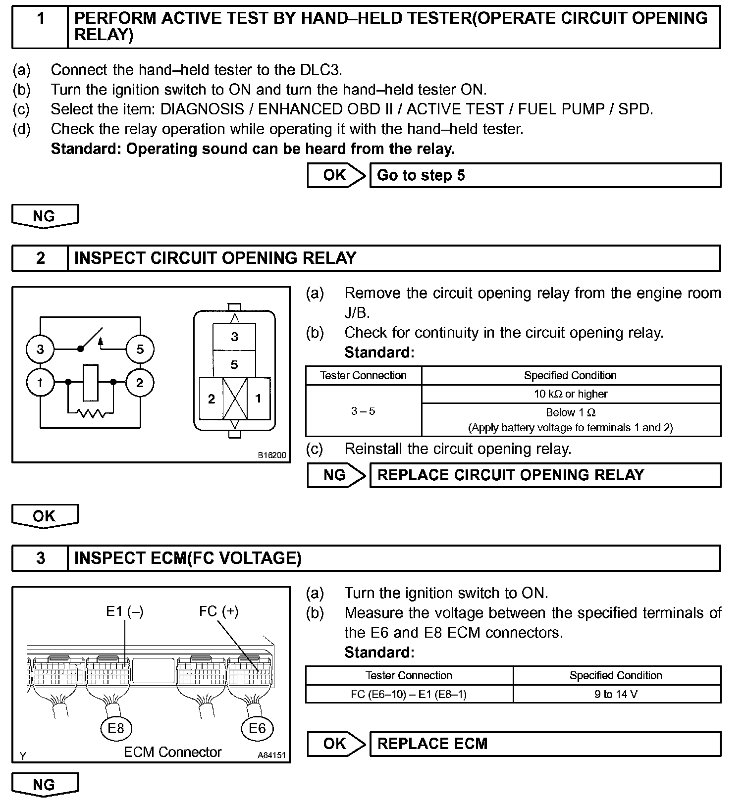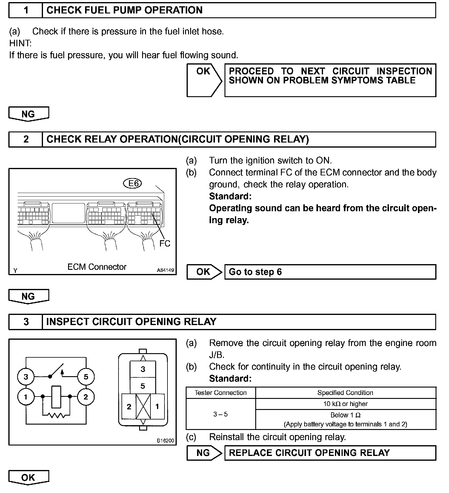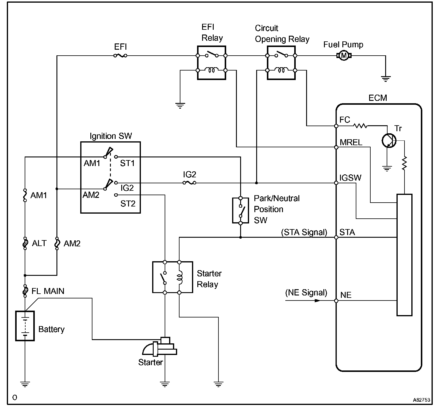 When the engine is cranked, current flows from the ignition switch terminal ST1 to the starter relay (Marked: ST), and current flows to terminal STA of ECM (STA signal). When the STA signal and NE signal are input to the ECM, Tr is turned ON, current flows to coil of the circuit opening relay (Marked: C/OPN), the relay switches on, power is supplied to the fuel pump and the fuel pump operates. While the NE signal is generated and the engine is running, the ECM keeps Tr ON (circuit opening relay ON) and the fuel pump also keeps operating.