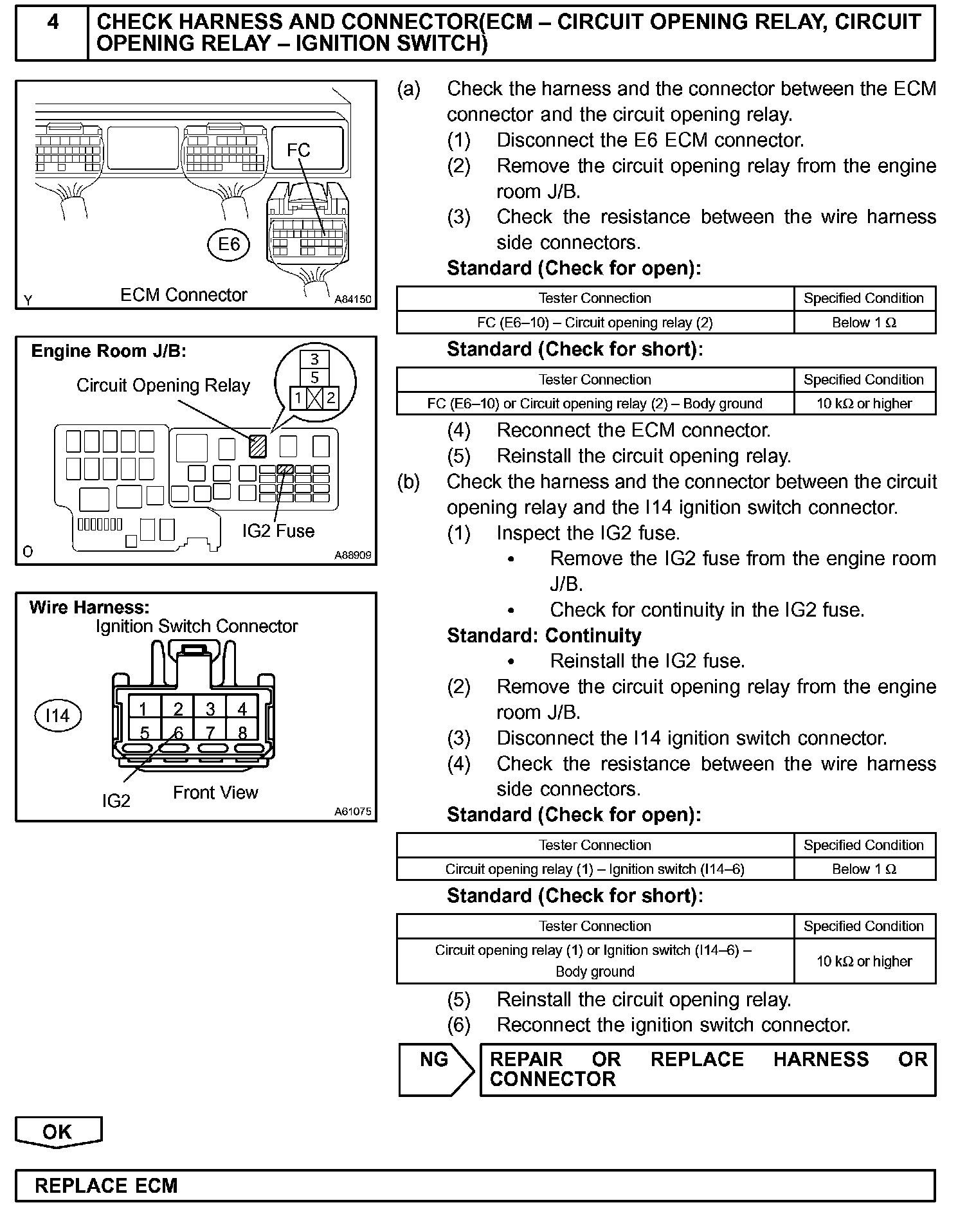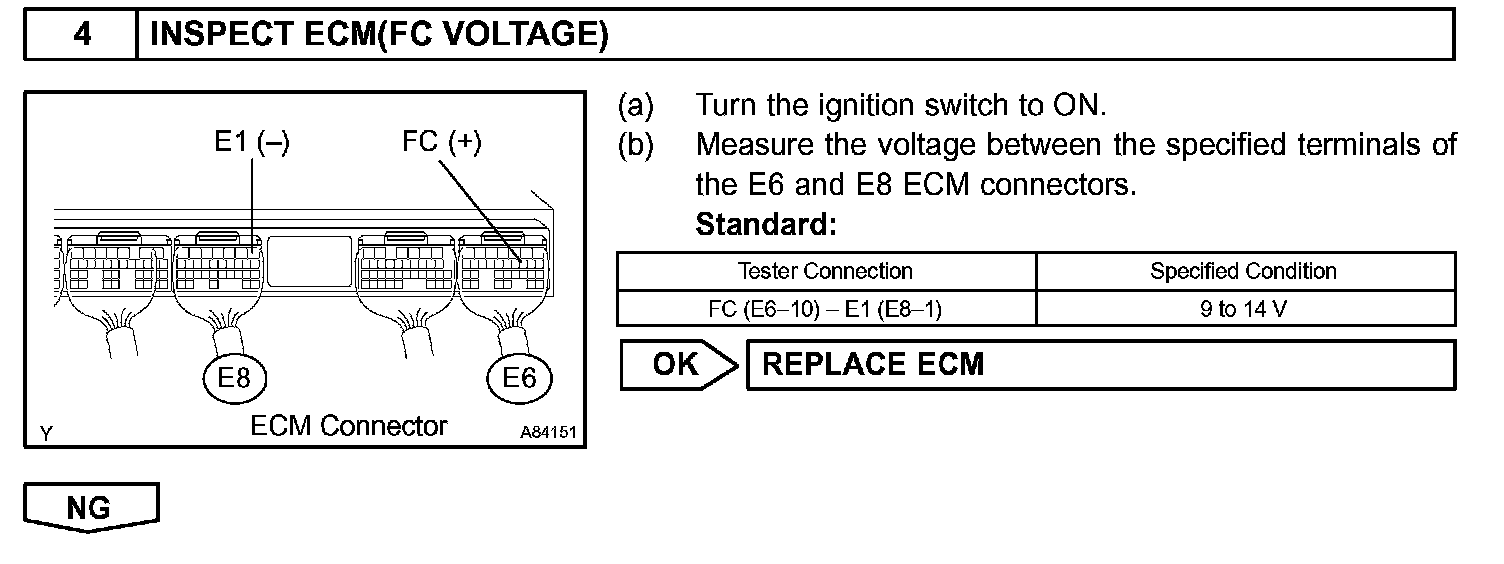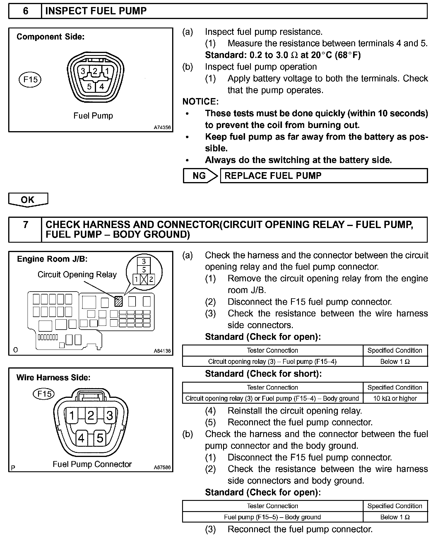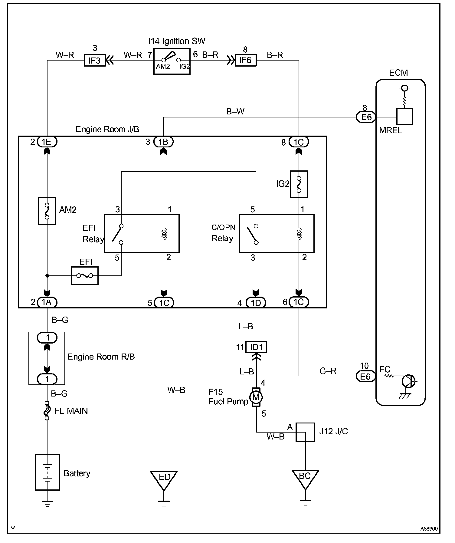 When the engine is cranked, current flows from the ignition switch terminal ST1 to the starter relay (Marked: ST), and current flows to terminal STA of ECM (STA signal). When the STA signal and NE signal are input to the ECM, Tr is turned ON, current flows to coil of the circuit opening relay (Marked: C/OPN), the relay switches on, power is supplied to the fuel pump and the fuel pump operates. While the NE signal is generated and the engine is running, the ECM keeps Tr ON (circuit opening relay ON) and the fuel pump also keeps operating.