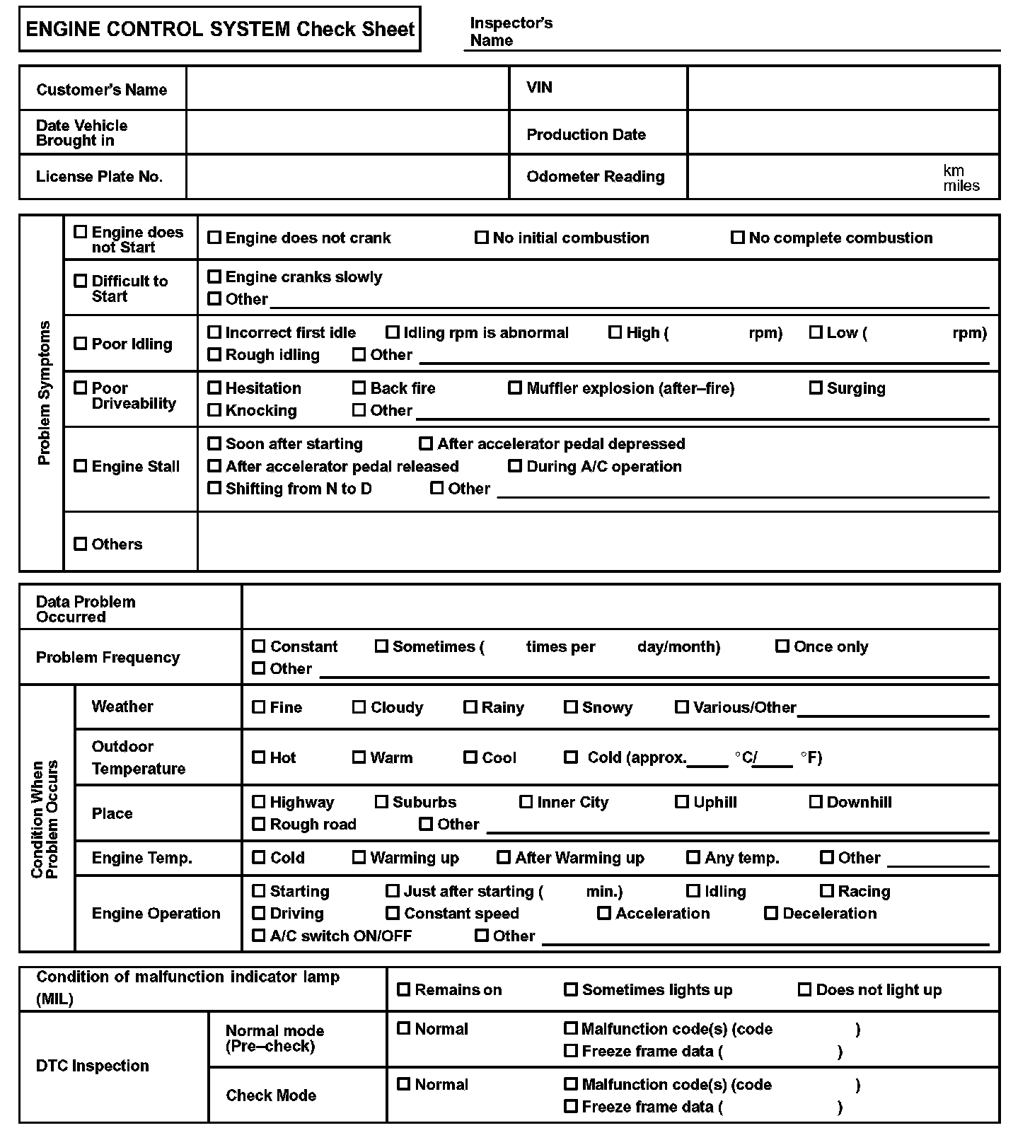 Engine Control System Check Sheet: