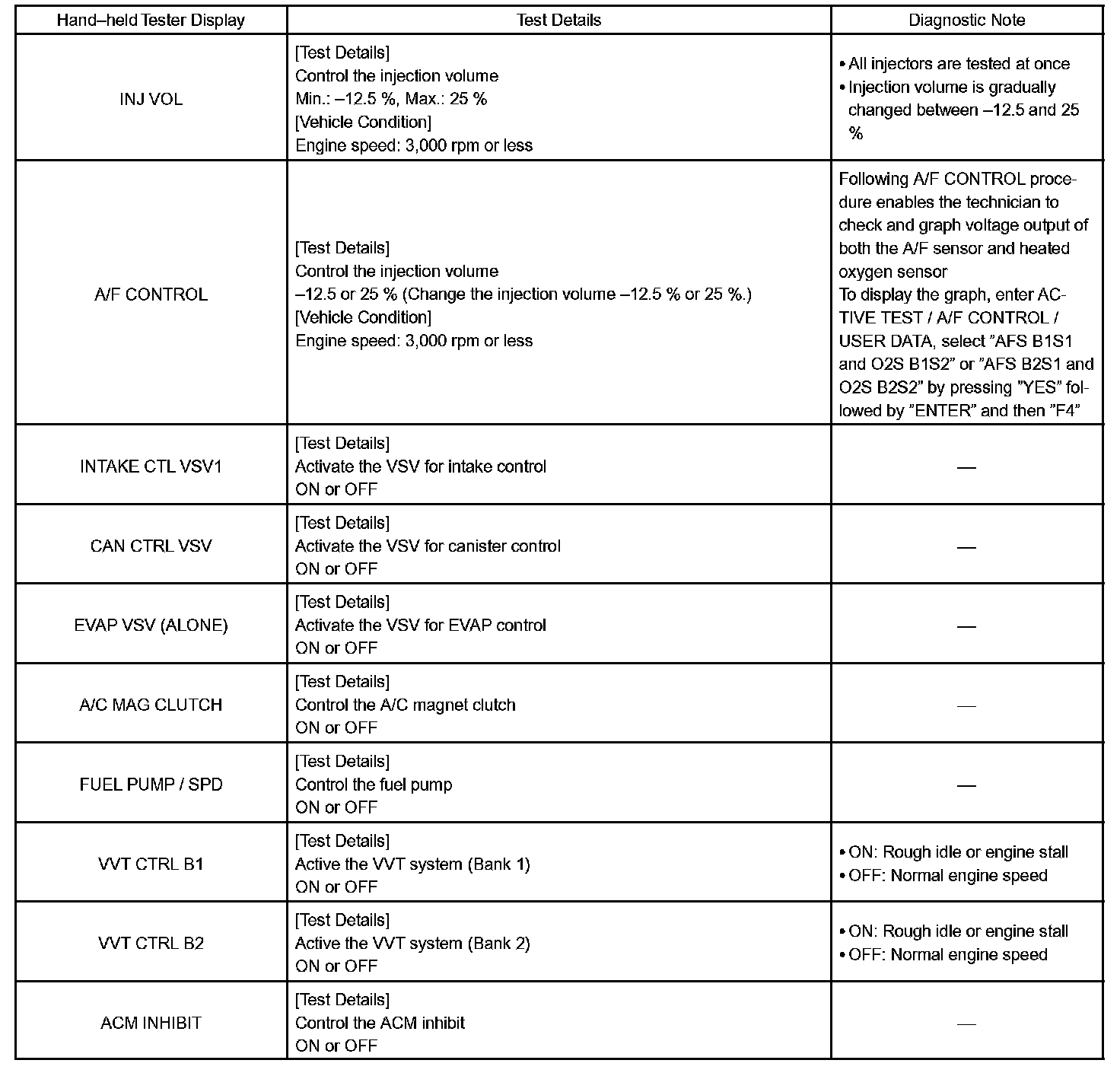 ACTIVE TESTHINT: Performing the ACTIVE TEST using the hand-held tester or the OBD II scan tool allows the relay, VSV, actuator and so on to operate without parts removal. Performing the ACTIVE TEST as a first step of troubleshooting is one method to shorten diagnostic time. It is possible to display the DATA LIST during the ACTIVE TEST.