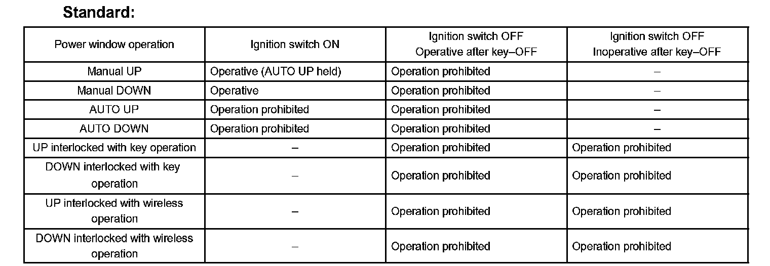 POWER WINDOW FAIL-SAFE FUNCTIONWhen an abnormality is detected in the limit switch and pulse sensor for operating the jam protection function (DTC: B1231, B1232, B1233, B1234), the following power window operations will be prohibited for fail-safe.