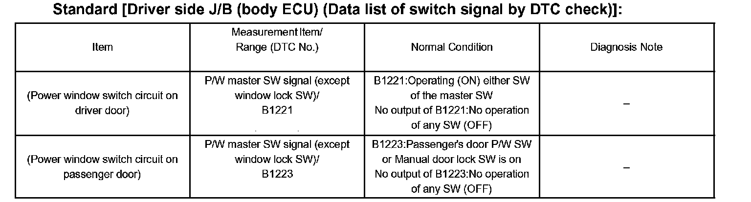 HINT: DTC No. B1221 and B1223 are the codes to inform of each switch condition and will be output when the switch is ON. In that these codes are displayed operating the switch or the switch or the codes are not displayed even with operating the switch, there may be trouble in the switch circuit.