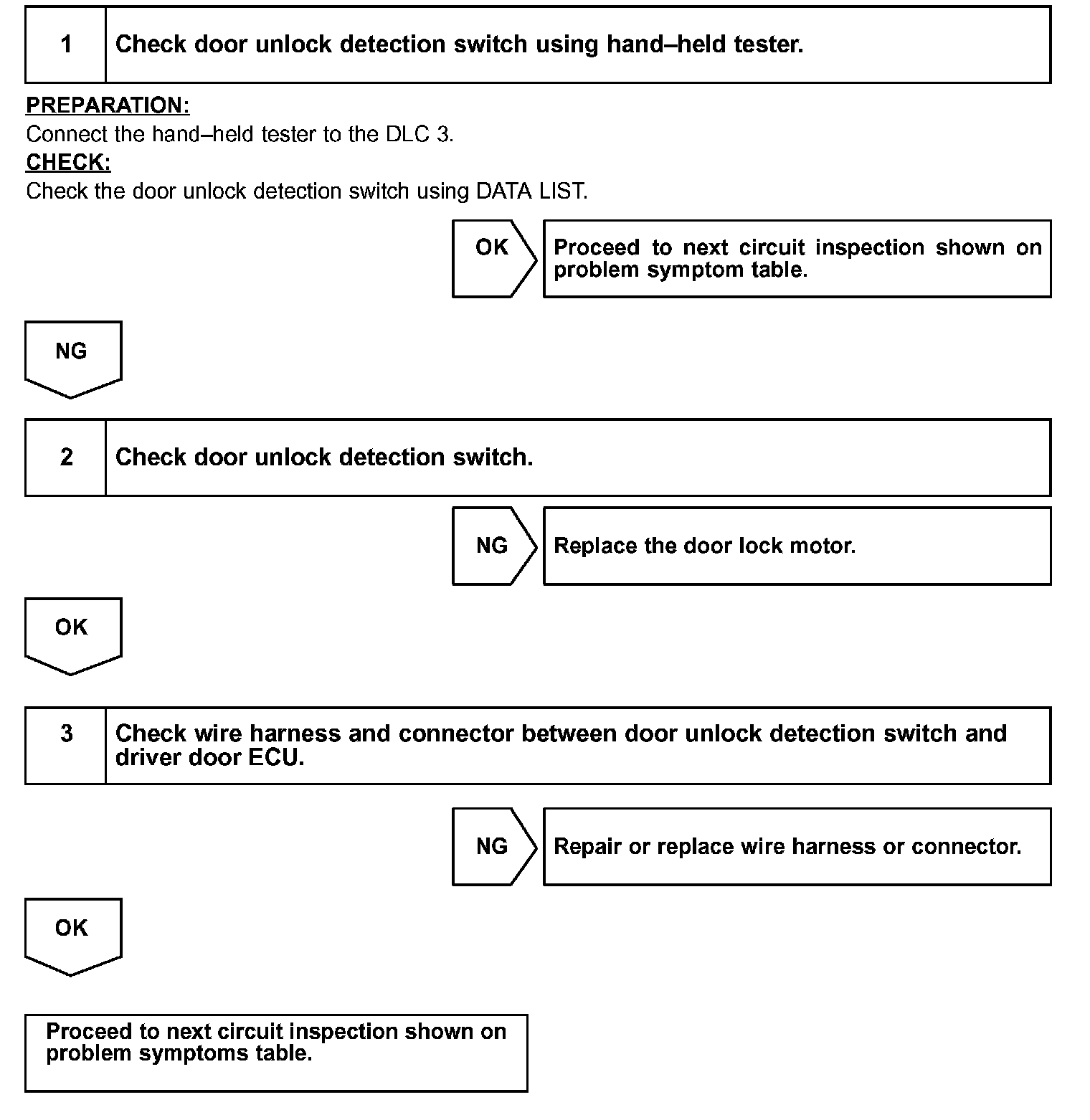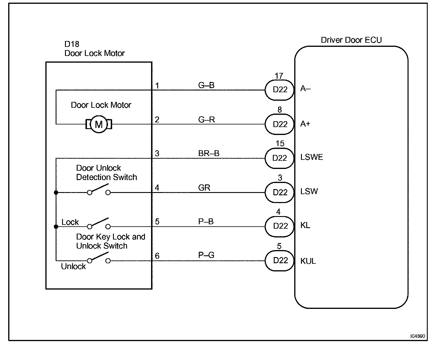 The door unlock detection switch is built in the door lock motor assembly. This switch is ON when the door lock knob is in the unlock position and OFF when the lock knob is in the lock position. The ECU detects the door lock knob conditions is this circuit. It is used as one of the operating conditions for the key confinement prevention function.