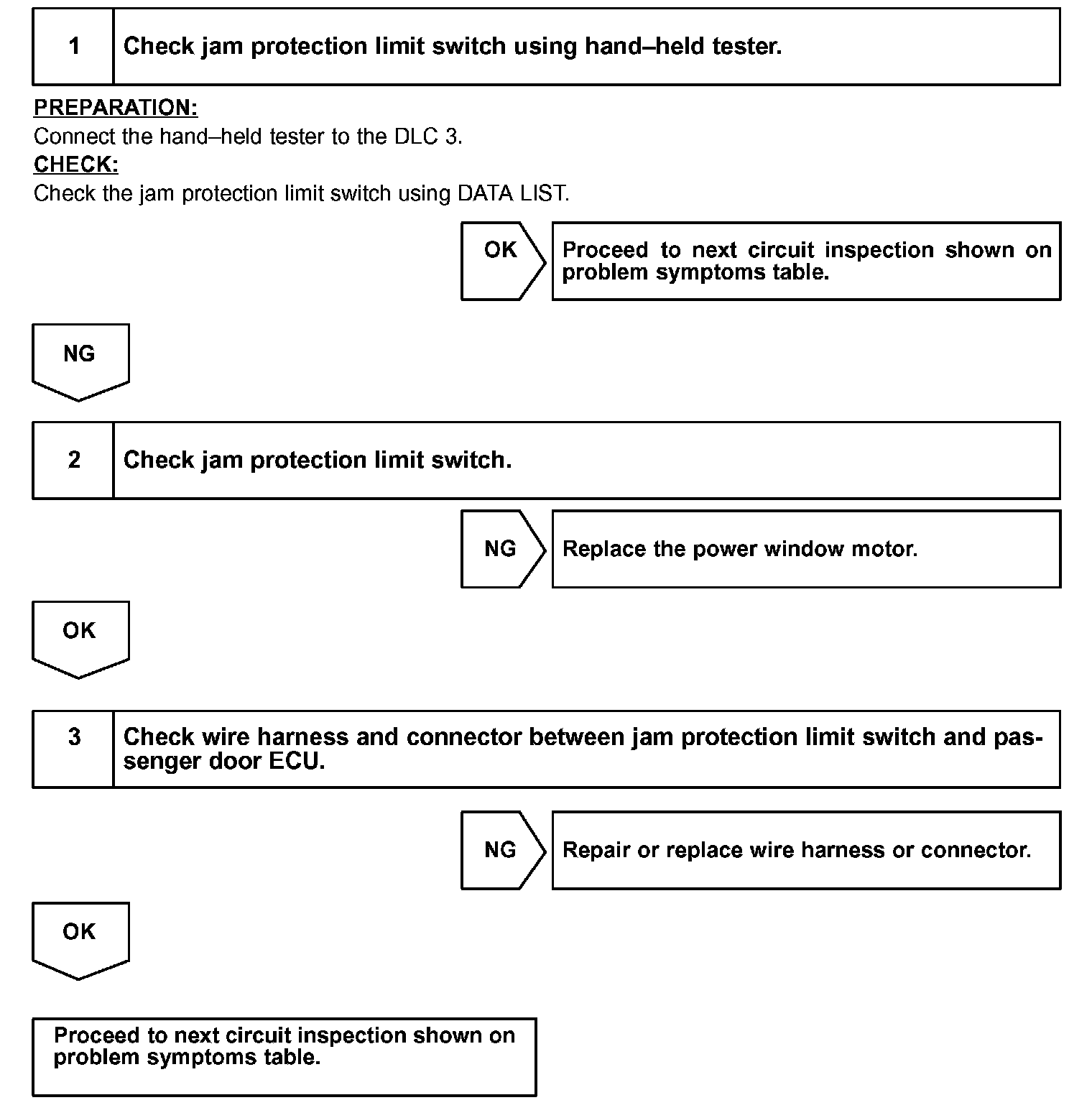 Jam protection limit switch is built-in the power window motor. This switch functions to turn "OFF" before the top dead center, and ECU reads this "OFF" signal resulting in closing the window fully.