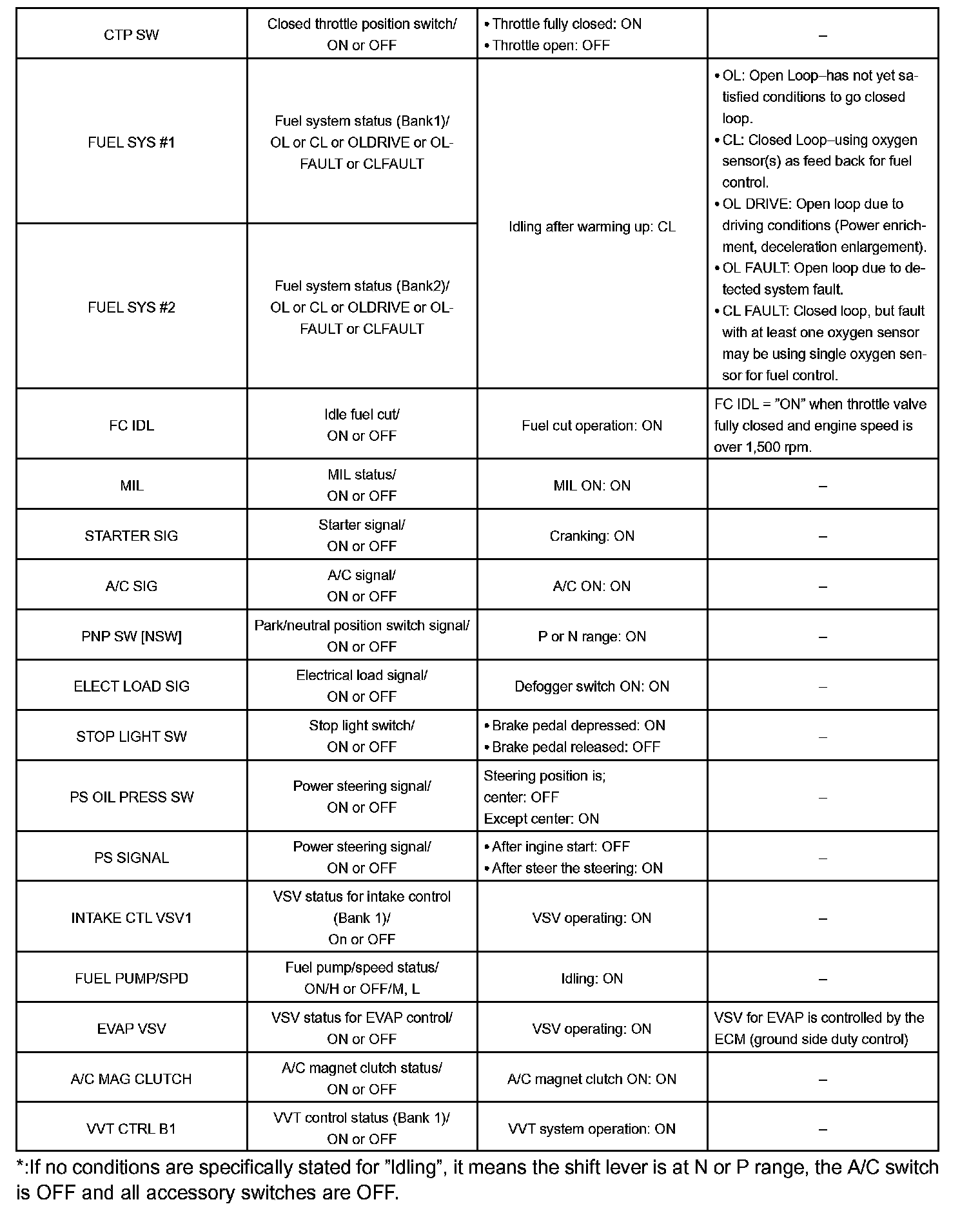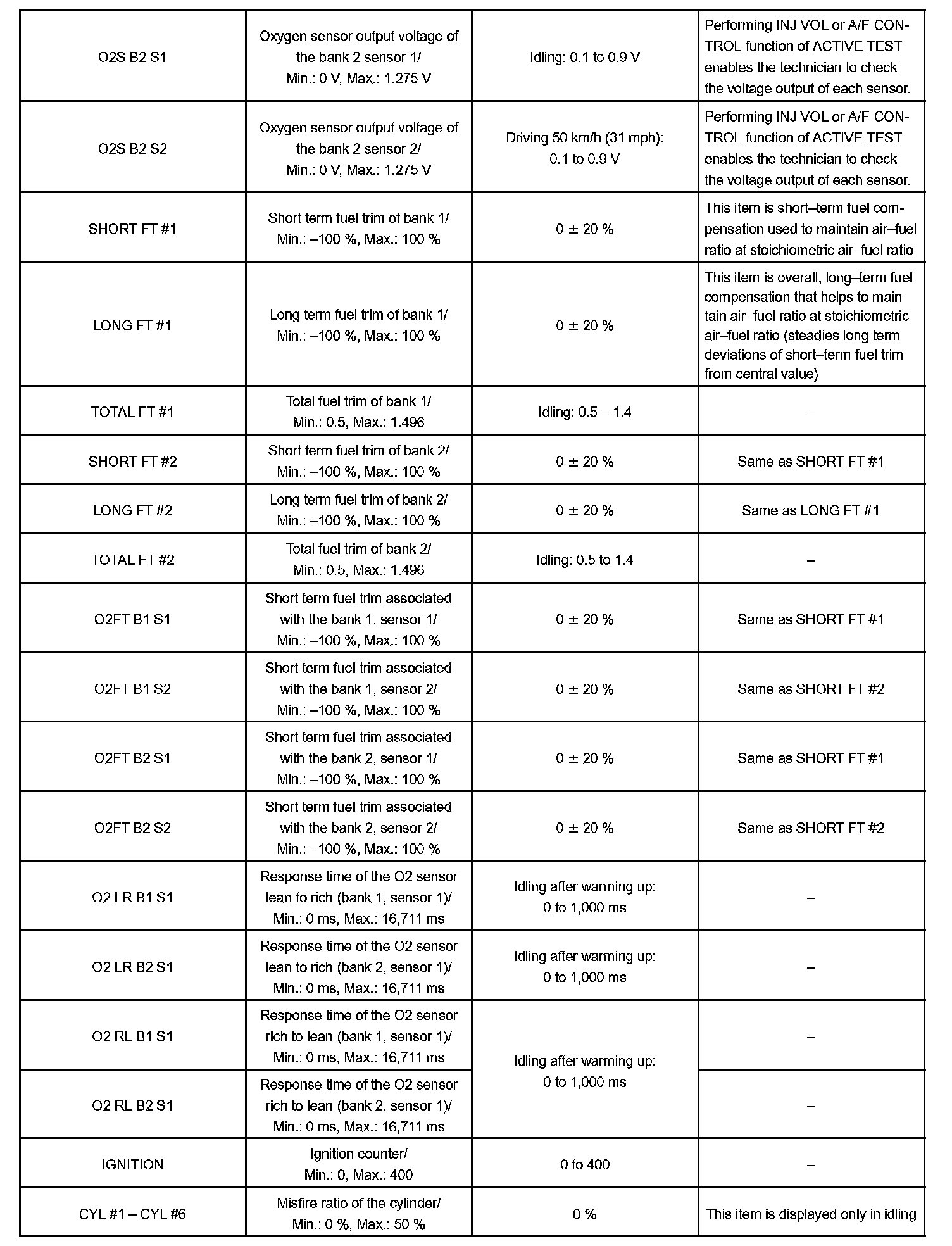 HINT: Using the hand-held tester DATA LIST allows switch, sensor, actuator and other item values to be read without removing any parts. Reading the DATA LIST early in troubleshooting is one way to shorten labor time.